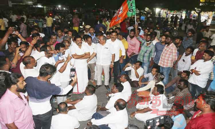 இந்த நிலையில் பாஜக அலுவலகம் மீது வெடிகுண்டு வீசப்பட்ட சம்பவத்துக்கு எதிர்ப்பு தெரிவித்து கோவை காந்திபுரம் பஸ் நிலையம் எதிரே பா.ஜ.க.வினர் ஒன்று திரண்டு சாலை மறியல் போராட்டத் தில் ஈடுபட்டனர். இதற்கு இந்து முன்னணி மாநில தலைவர் காடேஸ்வரா சுப்பிரமணியம் தலைமை தாங்கினார்.மறியலில் ஈடுபட்டவர்கள் பா.ஜ.க. அலுவலகம் மீது வெடிகுண்டு வீசியவர்களை உடனடியாக கைது செய்ய வேண்டும் என்று கோஷங்களை எழுப்பினர். இதையொட்டி அங்கு போலீசார் குவிக்கப்பட்டனர்.