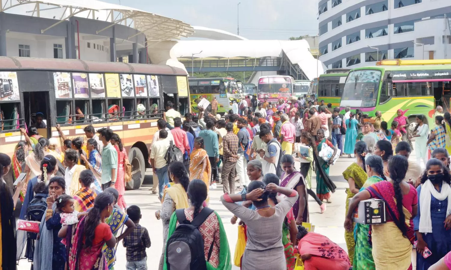 ஸ்மார்ட் சிட்டி பஸ் நிலையத்தில் தரையில் அமரும் பயணிகள்
