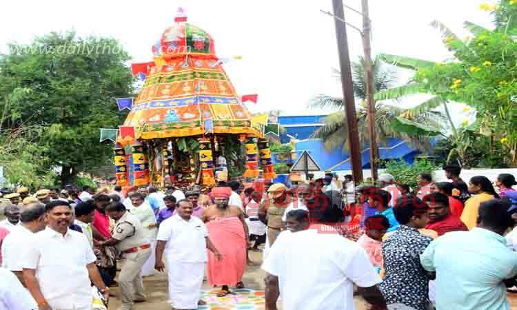 குன்றக்குடி ஆதீனம் பொன்னம்பல அடிகளார் பச்சை கொடி அசைத்து தேரை வடம் பிடித்து தொடங்கி வைத்தார். இதை தொடர்ந்து பக்தர்கள் வடம் பிடித்து தேரை இழுத்தனர். 4 ரதவீதிகளிலும் தேர் உலா வந்து நிலையை அடைந்தது.