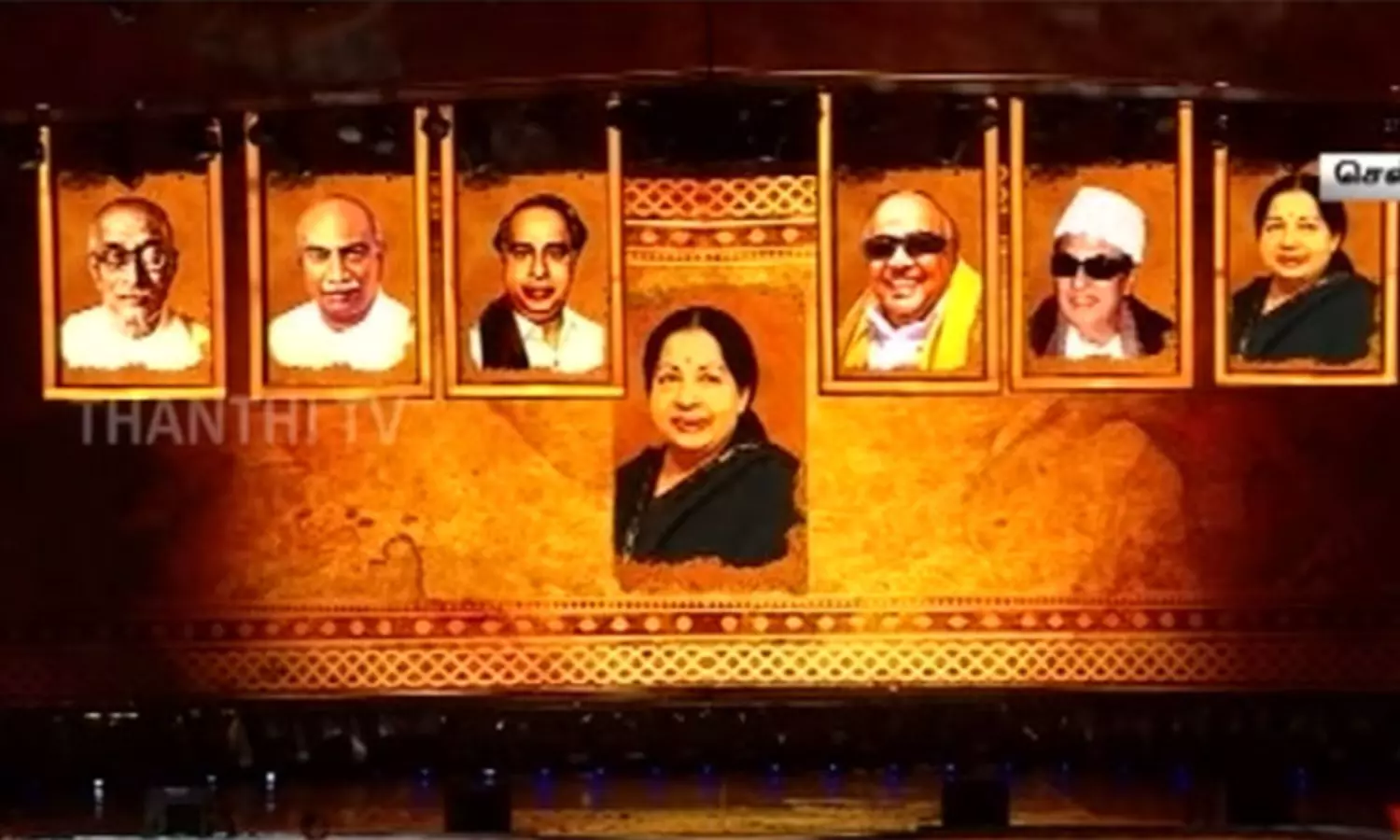 விழாவின் மேடையில் முன்னாள் முதல்-அமைச்சர்களான ராஜாஜி, காமராஜர், அறிஞர் அண்னா, எம்.ஜி.ஆர்., ஜெயலலிதா, கலைஞர் கருணாநிதி புகைப்படங்கள் ஒன்றன் பின் ஒன்றாக காட்சிப்படுத்தப்பட்டன. விழாவில் கருப்பு நிற உடையில் முதல்-அமைச்சர் மு.க.ஸ்டாலின் கலந்து கொண்டார்.