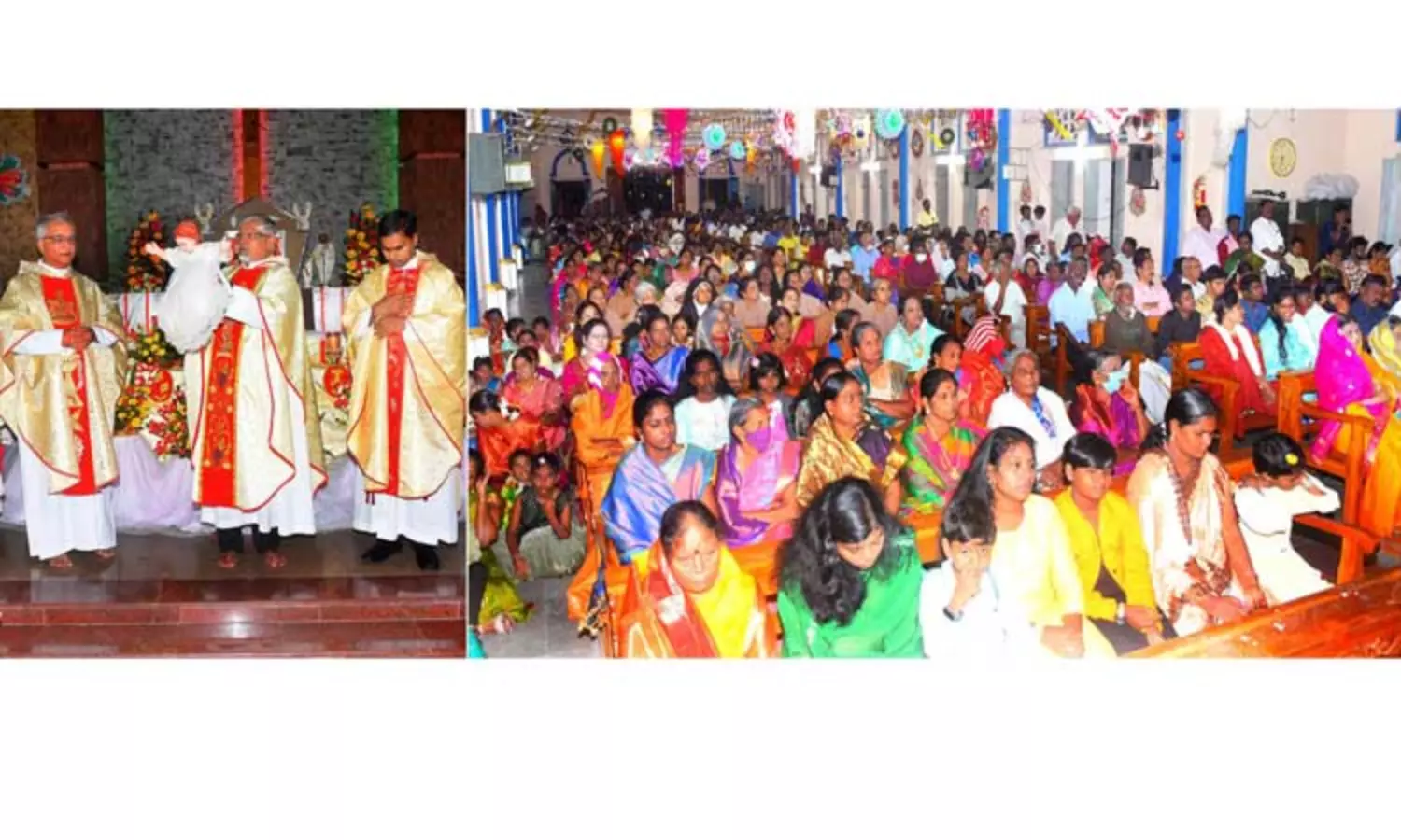 தொடர்ந்து, நள்ளிரவு 12 மணிக்கு ஆலயங்களில் மணி அடித்த போது, ஏசு பிறந்ததை உணர்த்தும் விதமாக, குழந்தை ஏசுவின் சொரூபத்தை அருட்தந்தை ஜோசப் பிரான்சிஸ் தலைமையில் எடுத்து சென்று அங்குள்ள குடிலில் வைக்கப்பட்டது. பின்னர் சிறப்பு பிரார்த்தனை நடைபெற்றது.