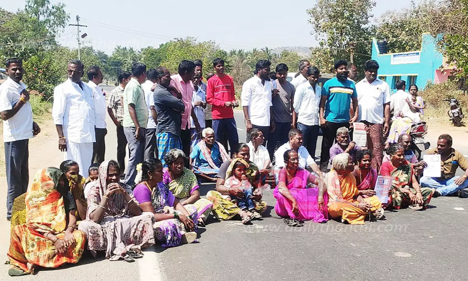 கே.வி.குப்பத்தை அடுத்த சென்னங்குப்பம், பி.கே.புரம் ஊராட்சிகளை சேர்ந்த பொதுமக்கள் குடியாத்தம் - காட்பாடி தேசிய நெடுஞ்சாலையில், சென்னங்குப்பம் பகுதியில் உள்ள கிராம நிர்வாக அலுவலர் அலுவலகம் எதிரில் கொளுத்தும் வெயிலில் சாலை மறியலில் ஈடுபட்டனர். இதுபற்றி தகவல் அறிந்ததும் குடியாத்தம் துணை போலீஸ் சூப்பிரண்டு ராமமூர்த்தி, தாசில்தார் அ.கீதா, வருவாய் ஆய்வாளர் என்.டி.கண்ணன், போலீஸ் இன்ஸ்பெக்டர் செந்தில்குமாரி, சப்-இன்ஸ்பெக்டர்கள் சிவசந்திரன், செல்வகுமார், ஒன்றியக் குழு உறுப்பினர் சுரேஷ்குமார் உள்ளிட்டோர் சென்று பேச்சுவார்த்தை நடத்தினர்.
