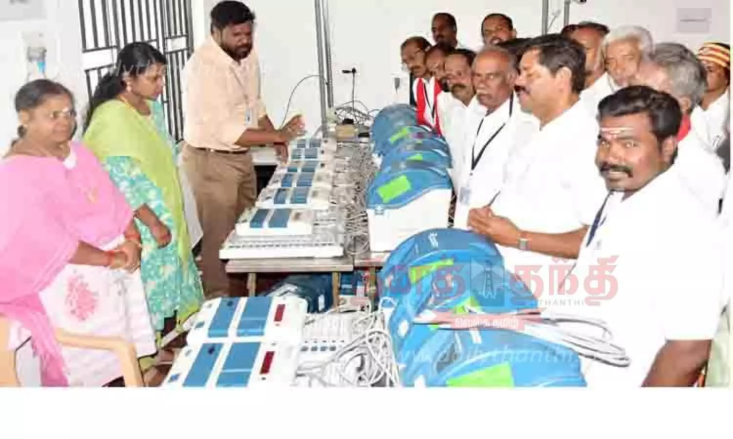 புதுக்கோட்டை கலெக்டர் அலுவலக வளாகத்தில் அமைந்துள்ள மின்னணு வாக்குப்பதிவு எந்திரங்கள், வி.வி.பேட் பாதுகாப்பு வைப்பறையில் வைக்கப்பட்டுள்ள வாக்குப்பதிவு எந்திரங்களுக்கான முதல் நிலை சோதனைகள் நடத்தப்பட்டது. இதில் பழுது நீங்கலாக 3,277 வாக்குப்பதிவு எந்திரங்கள், 2,106 கட்டுப்பாட்டு எந்திரங்கள், 2,390 வி.வி.பேட் உள்ளிட்டவைகள் ஏற்கப்பட்டுள்ளது. இந்த வாக்குப்பதிவு எந்திரங்களை அங்கீகரிக்கப்பட்ட அரசியல் கட்சியினரால் தேர்ந்தெடுக்கப்பட்டு வாக்குப்பதிவு எந்திரங்களில் மாதிரி வாக்குப்பதிவு நடைபெறுவதை அங்கீகரிக்கப்பட்ட அரசியல் கட்சி பிரமுகர்கள் முன்னிலையில் கலெக்டர் மெர்சி ரம்யா பார்வையிட்டு ஆய்வு மேற்கொண்டார். இந்தநிகழ்வில், மாவட்ட வருவாய் அலுவலர் செல்வி, தனி தாசில்தார் (தேர்தல்) சோனை கருப்பையா உள்பட அலுவலர்கள் உடன் இருந்தனர்.