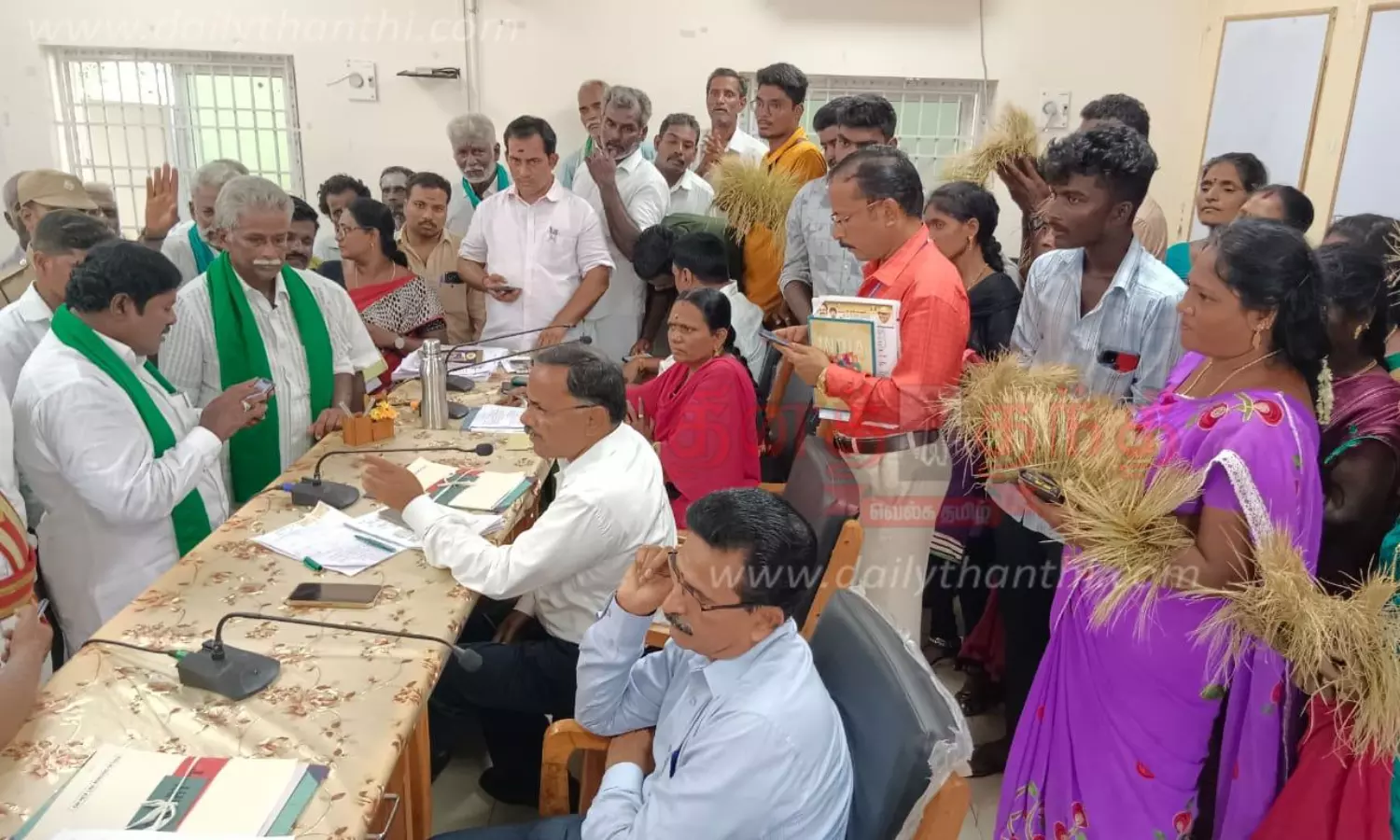 காய்ந்த நாற்றுகளுடன் மனு கொடுக்க வந்த விவசாயிகள்