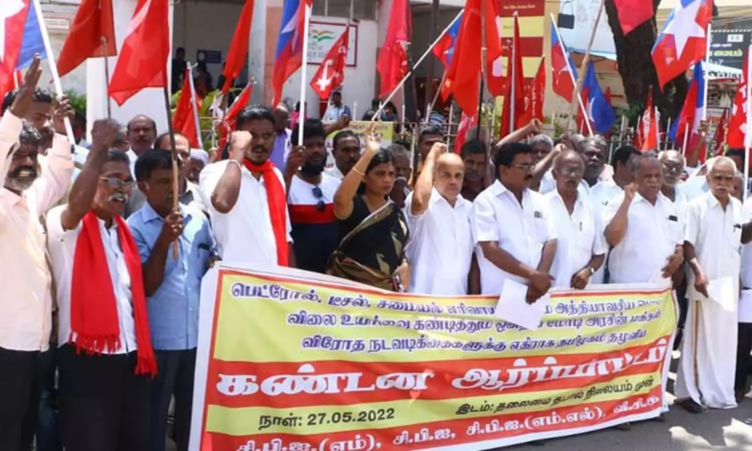 பெட்ரோல்- டீசல், கியாஸ் உள்ளிட்ட பொருட்கள் மீதான வரிகளை முழுமையாக கைவிட வேண்டும், விலை உயர்வை மொத்தமாக திரும்ப பெறவேண்டும், பருப்பு, எண்ணெய் உள்ளிட்ட அனைத்து அத்தியாவசிய பொருட்களையும் ரேஷன் கடைகள் மூலம் வழங்க வேண்டும், வருமான வரி வரம்பை எட்டாத அனைத்து குடும்பங்களுக்கும் மாதம் ரூ.7,500 வழங்க வேண்டும், வேலைவாய்ப்பை பெருக்க வேண்டும் என்பன உள்ளிட்ட பல்வேறு கோரிக்கைகளை வலியுறுத்தி நாடு முழுவதும் நேற்று கம்யூனிஸ்டு கட்சிகள் சார்பில் ஆர்ப்பாட்டம் நடந்தது.