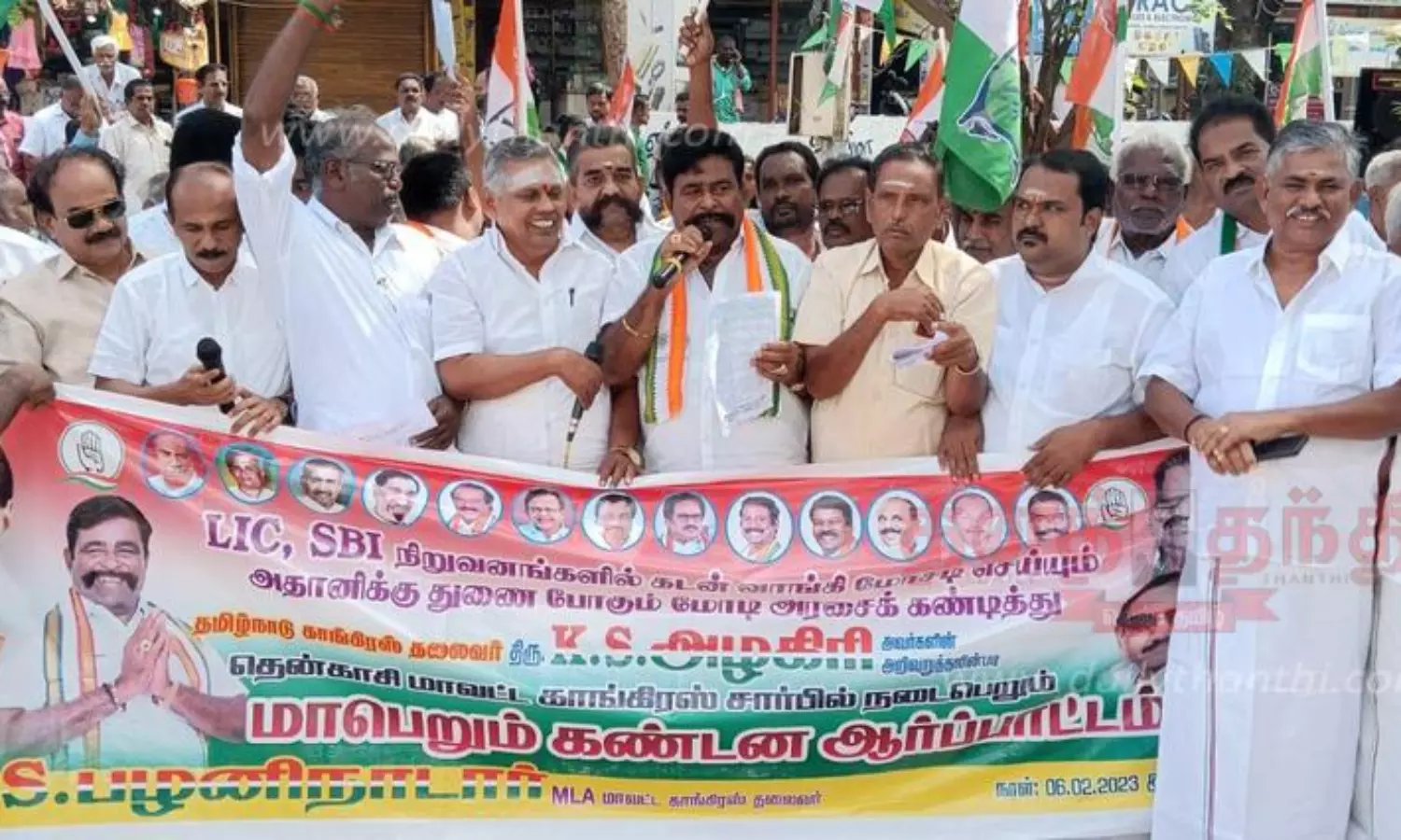எல்.ஐ.சி., எஸ்.பி.ஐ. நிறுவனங்களில் கடன் வாங்கி திருப்பி செலுத்தாத அதானி குழுமத்திற்கு மத்திய அரசு துணை போவதாக கூறி அதனை கண்டித்து தென்காசி புதிய பஸ் நிலையம் அருகில் மாவட்ட காங்கிரஸ் கட்சி சார்பில் நேற்று ஆர்ப்பாட்டம் நடைபெற்றது. ஆர்ப்பாட்டத்திற்கு மாவட்ட தலைவர் பழனி நாடார் எம்.எல்.ஏ. தலைமை தாங்கினார். மாநில செயலாளர் ஆலங்குளம் செல்வராஜ், பொதுக்குழு உறுப்பினர் சட்டநாதன், மாவட்ட பொருளாளர் முரளிராஜா, சுரண்டை நகராட்சி தலைவர் வள்ளிமுருகன் உள்பட பலர் கலந்து கொண்டனர்.