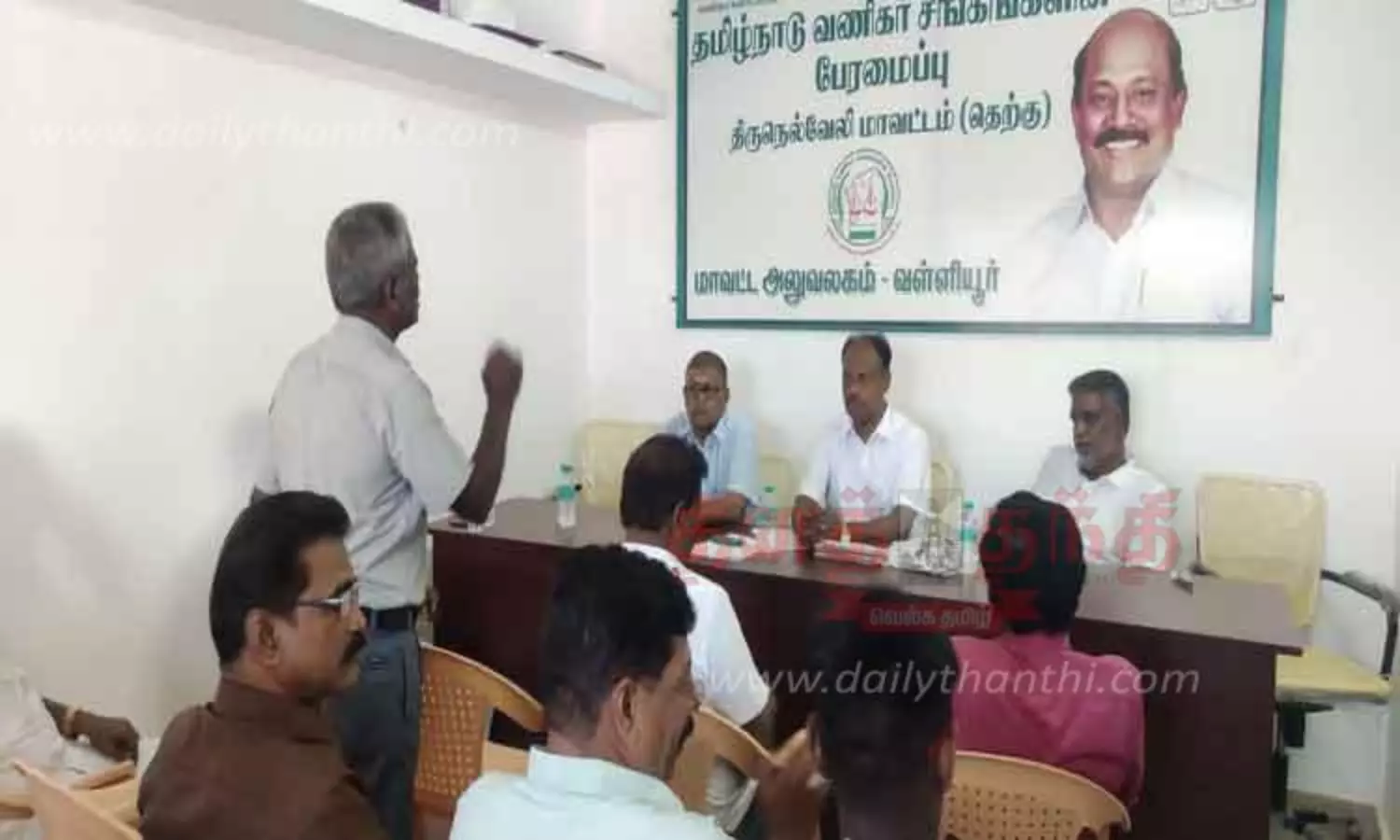 கூட்டத்தில் பணகுடி, வள்ளியூர், ஏர்வாடி, நாங்குநேரி பேரூராட்சி பஸ்நிலையத்திற்குள் அனைத்து அரசு பஸ்களும் வந்து செல்ல பேரூராட்சிகளில் தீர்மானம் நிறைவேற்ற வேண்டும். இந்த பிரச்சினை தொடர்பாக தமிழ்நாடு வணிகர் சங்கங்களின் பேரமைப்பு மாநில தலைவர் விக்கிரமராஜா தலைமையில் போக்குவரத்து அமைச்சரை நேரில் சந்தித்து வலியுறுத்துவது, அரசு பஸ்கள் பேரூராட்சி பஸ்நிலையத்திற்கு வந்து செல்லாமல் புறவழிச்சாலையில் செல்வதற்கு உடந்தையாக செயல்படும் நாகர்கோவில் போக்குவரத்து கழக துணை வணிக மேலாளர் மீது துறைரீதியிலான நடவடிக்கை எடுக்க கேட்டுக் கொள்வது என தீர்மானிக்கப்பட்டது.