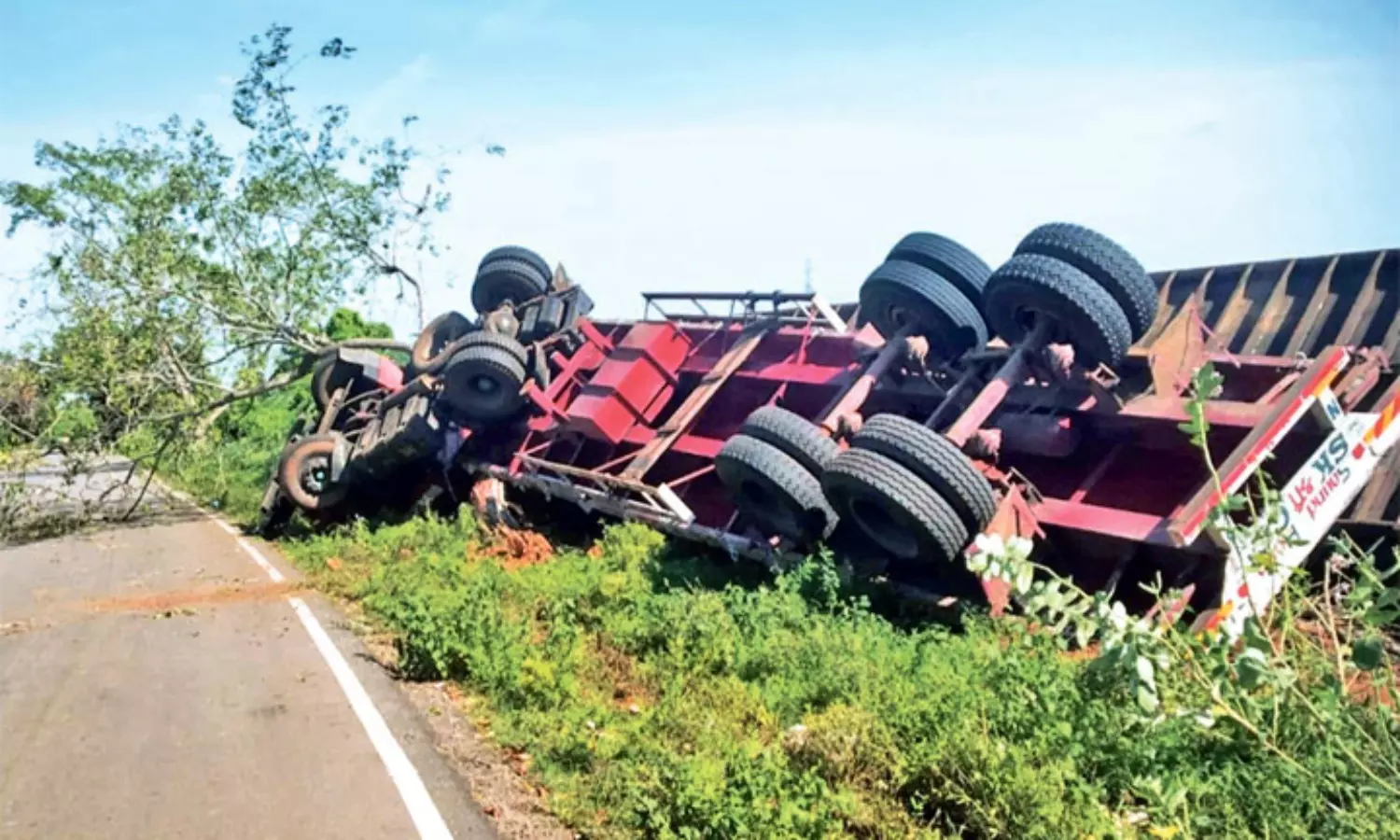 கும்மிடிப்பூண்டி அருகே கன்டெய்னர் லாரி மரத்தில் மோதி கவிழ்ந்தது - டிரைவர் படுகாயம்