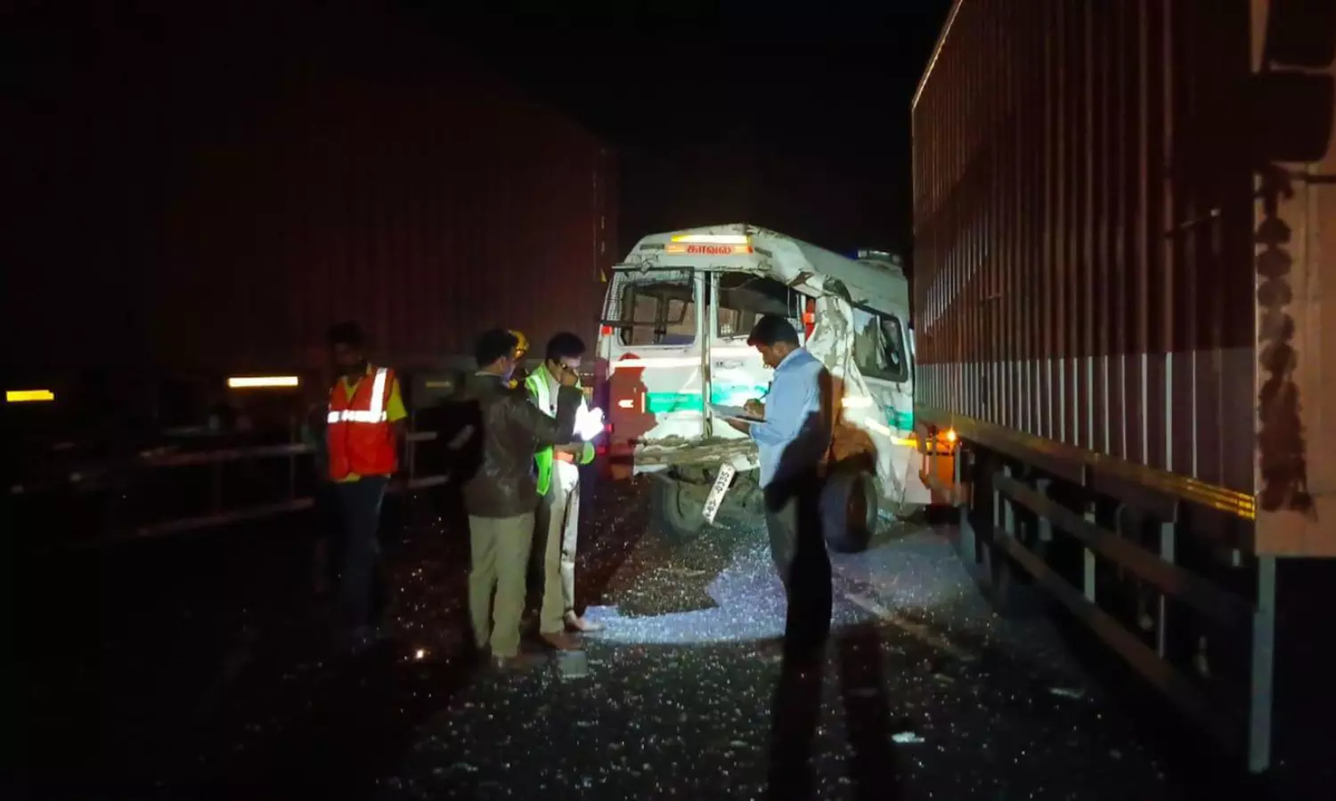 ஆம்பூர் அருகே பழுதாகி நின்ற லாரி குறித்து விசாரணை செய்ய சென்ற போது வேன் மீது கன்டெய்னர் லாரி மோதிய விபத்தில் 2 போலீசார் காயம் அடைந்தனர்.;