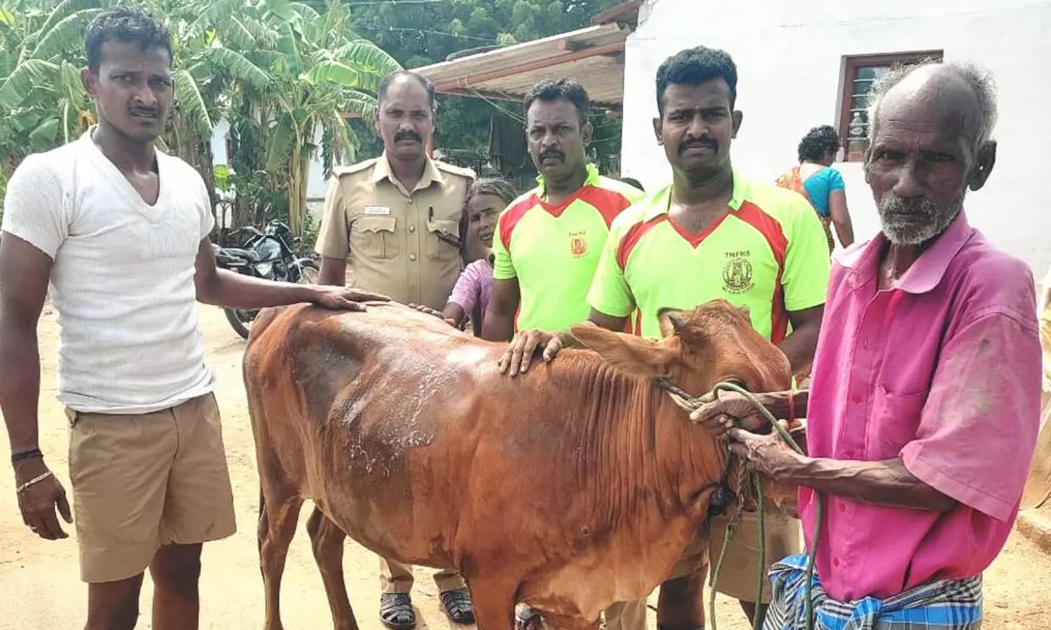 இது பற்றி தகவல் அறிந்த கருப்பணன் மற்றும் அக்கம் பக்கத்தில் உள்ளவர்கள் உடனடியாக சம்பவ இடத்திற்கு விரைந்து வந்து சாக்கடை கால்வாயில் இருந்து பசு மாட்டை பத்திரமாக மீட்க பல வழிகளில் முயன்றனர். ஆனால் அவர்களால் பசுமாட்டை மீட்க முடியாமல் தடுமாற்றம் அடைந்தனர்.
