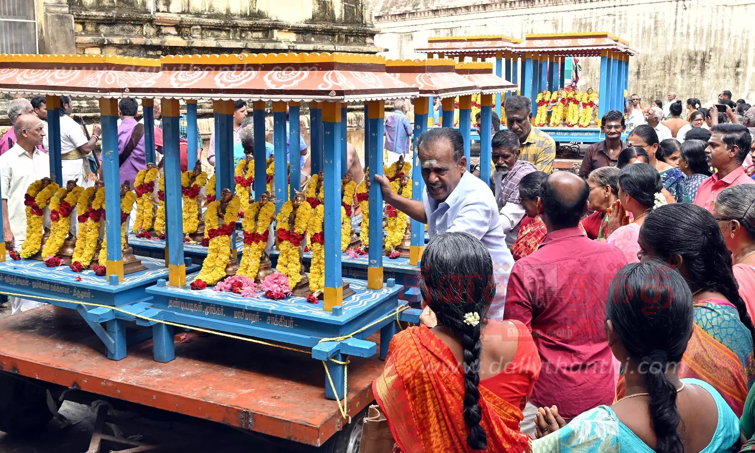 அப்போது வெள்ளிப்பல்லக்கில் விநாயகர், சுப்ரமணியர், சுவாமி, அம்பாள், சண்டிகேஸ்வரர் ஆகிய பஞ்சமூர்த்திகள் எழுந்தருளினர். பின்னர் கோவிலில் அப்பர், சுந்தரர், மாணிக்கவாசகர், திருநாவுக்கரசர் உள்ளிட்ட 63 நாயன்மார்களுக்கு சிறப்பு அபிஷேகம் நடைபெற்றது. இதையடுத்து அலங்கரிக்கப்பட்ட படிச்சட்டங்களில் 63 நாயன்மார்களின் உற்சவர்கள் இரட்டை வீதியுலாவாக ஆதிகும்பேஸ்வரர், நாகேஸ்வரர் கோவில் வீதிகளில் உலா வரும் நிகழ்ச்சி நடந்தது. அப்போது கோவில் யானை மங்களம் முன்னே செல்ல, திருக்குடந்தை சிவனடியார் திருக்கூட்ட தலைவர் நடராஜன் தலைமையில் பக்தர்கள் தேவார திருமுறைகள் பாடியபடி சென்றனர்.