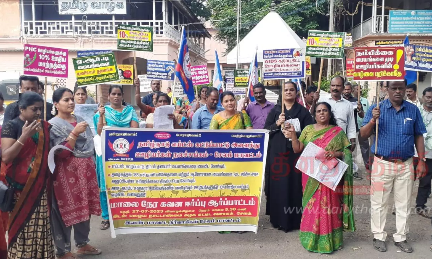 தமிழ்நாடு எய்ட்ஸ் கட்டுப்பாட்டு அனைத்து ஊழியர்கள் நலச்சங்கம் சார்பில் எய்ட்ஸ் கட்டுப்பாட்டு திட்டத்தை தனியார் மயமாக்குவதை கைவிட கோரியும், ஆரம்ப சுகாதார நிலையங்களில் பணிபுரியும் ஊழியர்களுக்கு 10 சதவீதம் ஊதிய உயர்வு வழங்க வேண்டும் உள்ளிட்ட பல்வேறு கோரிக்கைகளை வலியுறுத்தி சேலம் நாட்டாண்மை கட்டிடம் வளாகத்தில் நேற்று மாலை ஆர்ப்பாட்டம் நடந்தது. மாவட்ட தலைவர் ஜெகஜோதி தலைமை தாங்கினார். மாவட்ட செயலாளர் மலர்விழி, துணைத்தலைவர்கள் ராஜா, ஜெயக்குமார், மாநில பொருளாளர் ரமேஷ் உள்பட அரசு மருத்துவமனைகளில் எய்ட்ஸ் கட்டுப்பாட்டு பிரிவில் பணிபுரியும் ஊழியர்கள் பலர் கலந்து கொண்டனர். பின்னர் அவர்கள் கோரிக்கைகளை வலியுறுத்தி கோஷங்களை எழுப்பினர்.