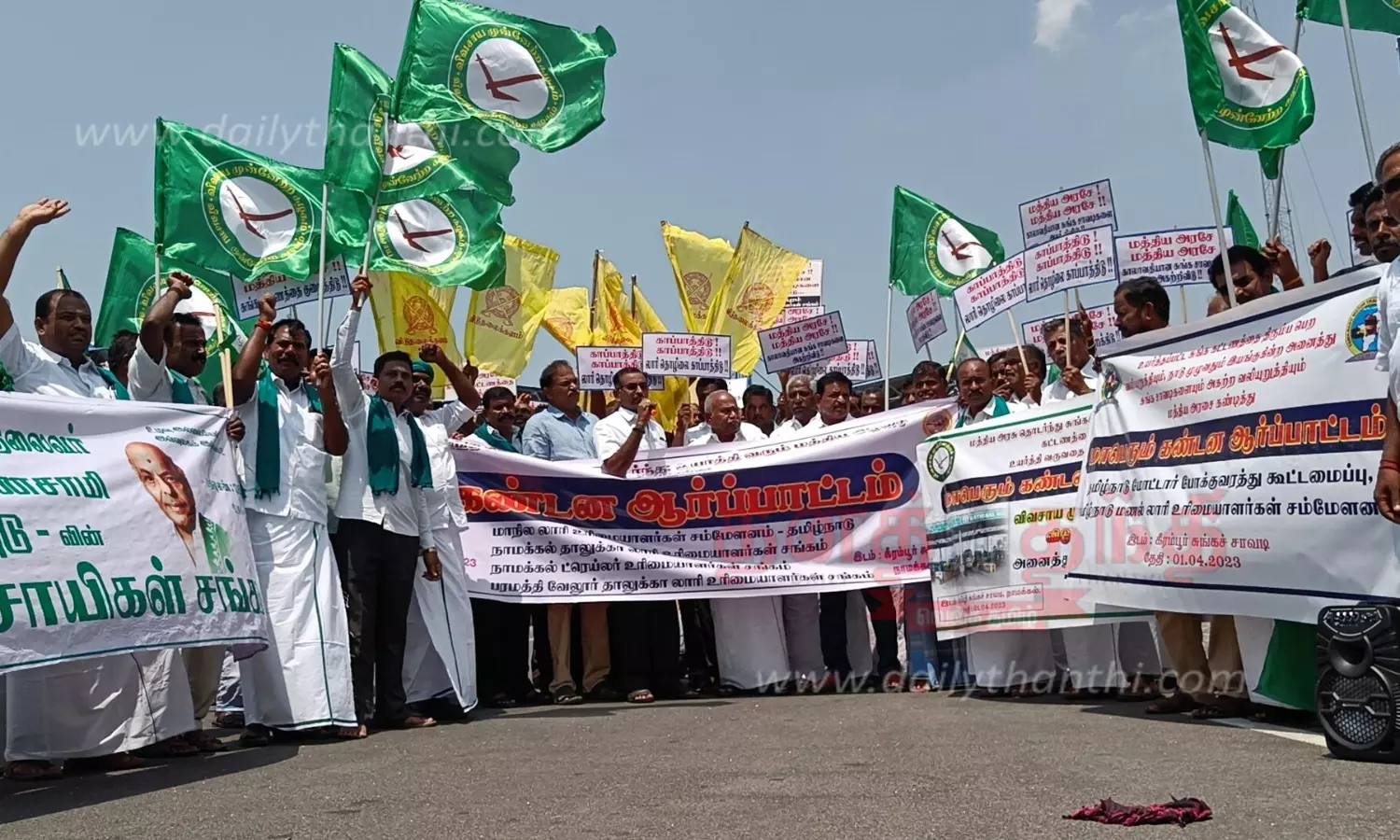 ஆர்ப்பாட்டத்தில் மாநில லாரி உரிமையாளர்கள் சம்மேளன மாநில பொருளாளர் தாமோதரன், தமிழ்நாடு மணல் லாரி உரிமையாளர்கள் சம்மேளன தலைவர் செல்லராஜாமணி, தமிழ்நாடு மணல் லாரி உரிமையாளர்கள் பாதுகாப்பு சங்கத் தலைவர் ராஜசேகர், நாமக்கல் டிரைலர் உரிமையாளர்கள் சங்க தலைவர் சின்னசாமி, விடுதலைகளம் கட்சி நிறுவன தலைவர் நாகராஜன், பரமத்தி வேலூர் தாலுகா லாரி உரிமையாளர் சங்கத் தலைவர் செந்தில்குமார், செயலாளர் பெரியசாமி, விவசாயிகள் முன்னேற்ற கழக மாநில பொதுச் செயலாளர் பாலசுப்பிரமணி உள்ளிட்ட 100-க்கும் மேற்பட்டோர் கலந்து கொண்டனர்.