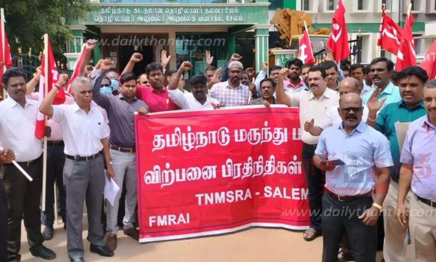 தமிழ்நாடு மருந்து மற்றும் விற்பனை பிரதிநிதிகள் சங்கத்தினர் நேற்று தொழிலாளர் அலுவலகம் முன்பு ஆர்ப்பாட்டம் நடத்தினர். இதற்கு சங்க தலைவர் செந்தில்குமார் தலைமை தாங்கினார். செயலாளர் விஜய் ஆனந்த், மாநில செயலாளர் பிரதீப் முன்னிலை வகித்தனர்.