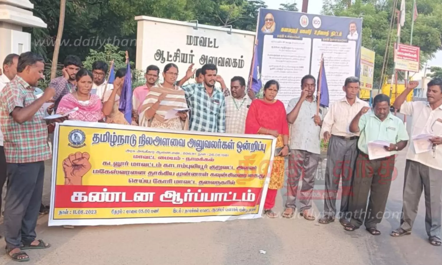 கடலூர் மாவட்டத்தில் காடாம்புலியூர் குறுவட்ட நில அளவையாளர் முருகேசன் தாக்கப்பட்டதை கண்டித்து நாமக்கல் மாவட்ட கலெக்டர் அலுவலகம் முன்பு தமிழ்நாடு நில அளவை அலுவலர்கள் ஒன்றிப்பு சார்பில் ஆர்ப்பாட்டம் நடந்தது. ஆர்ப்பாட்டத்திற்கு சங்கத்தின் மாவட்ட தலைவர் சண்முகசுந்தரம் தலைமை தாங்கினார். மாவட்ட செயலாளர் செந்தில்குமார், பொருளாளர் இளங்கோவன் ஆகியோர் முன்னிலை வகித்தனர். இதில் மாவட்ட இணை செயலாளர் சுபாஷ் வெங்கடேஷ், தமிழ்நாடு அரசு ஊழியர் சங்க மாவட்ட செயலாளர் முருகேசன் ஆகியோர் ஆர்ப்பாட்டத்தின் கோரிக்கைகள் குறித்து விளக்கிப் பேசினார்.
