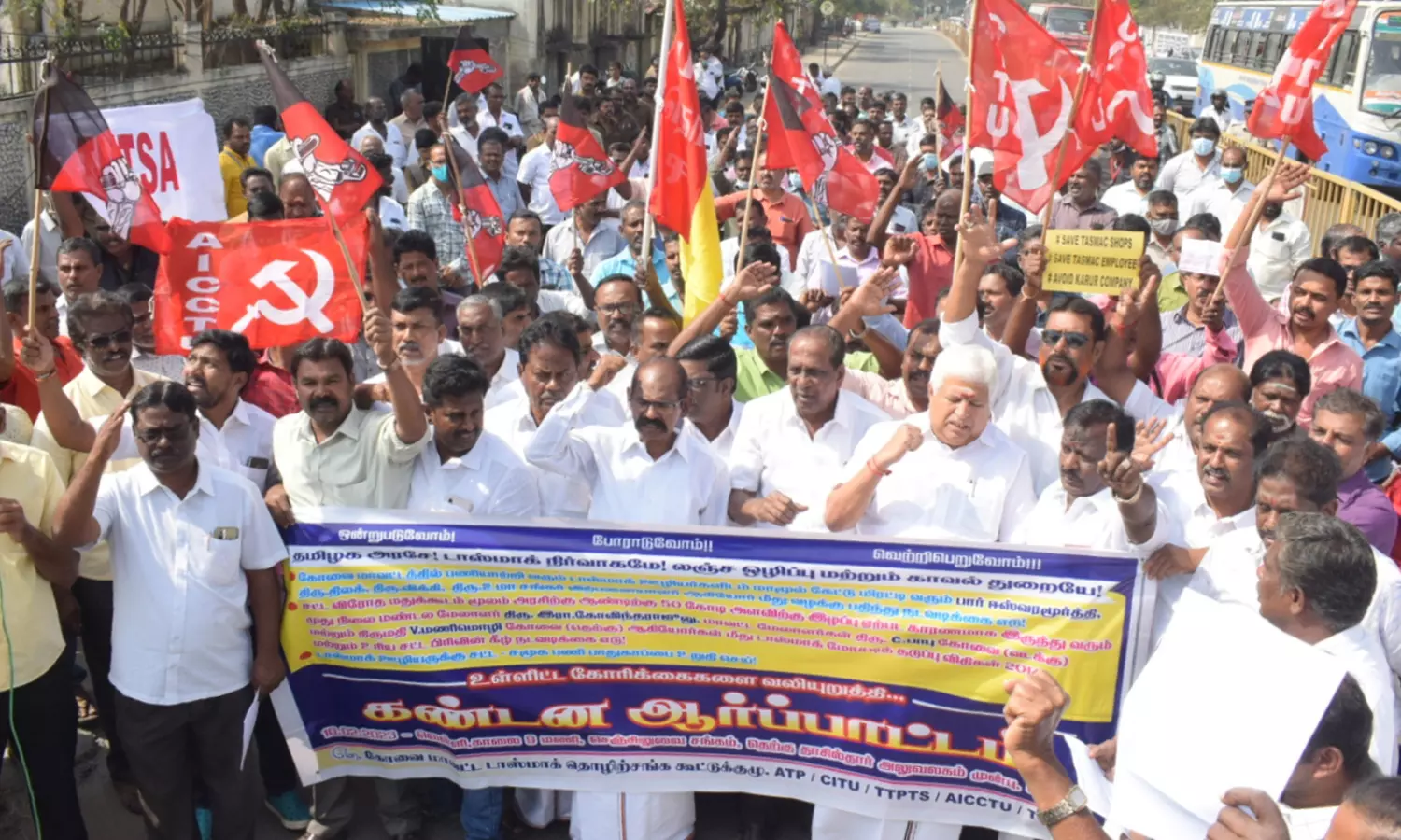 கோவை தெற்கு தாசில்தார் அலுவலகம் முன்பு பணி பாதுகாப்பு உள்ளிட்ட கோரிக்கைகளை வலியுறுத்தி டாஸ்மாக் தொழிற்சங்க கூட்டுக் குழுவினர் ஆர்ப்பாட்டத்தில் ஈடுபட்டனர். ஆர்ப்பாட்டத்திற்கு தலைவர் மூர்த்தி தலைமை தாங்கினார். மாநில பொது செயலாளர் திருச்செல்வம் உள்ளிட்ட 100-க்கும் மேற்பட்டவர்கள் கலந்து கொண்டு டாஸ்மாக் ஊழியர்களுக்கு பணி பாதுகாப்பு உள்ளிட்ட கோரிக்கைகளை வலியுறுத்தி கோஷம் எழுப்பினர்.ஆர்ப்பாட்டத்தில் கலந்து கொண்டவர்கள் கூறுகையில், சட்டவிரோத மதுக்கூடங்கள் நடத்திடகாரணமாக இருந்த அதிகாரிகள் மீது சட்டபூர்வமான நடவடிக்கை எடுத்து இழப்பீட்டுத் தொகையை வசூல் செய்ய வேண்டும். டாஸ்மாக் கடை ஊழியர்களை மிரட்டி பணம் பறிக்கும் கும்பல் மீது நடவடிக்கை எடுக்க வேண்டும். டாஸ்மாக் ஊழியர்களுக்கு பணி பாதுகாப்பை உறுதி செய்ய வேண்டும். தொழிற்சங்க தலைவர்கள் மீது பழி வாங்கும் நோக்கோடு செய்யப்பட்ட பணி மாறுதல்களை ரத்து செய்ய வேண்டும் என்றனர்.