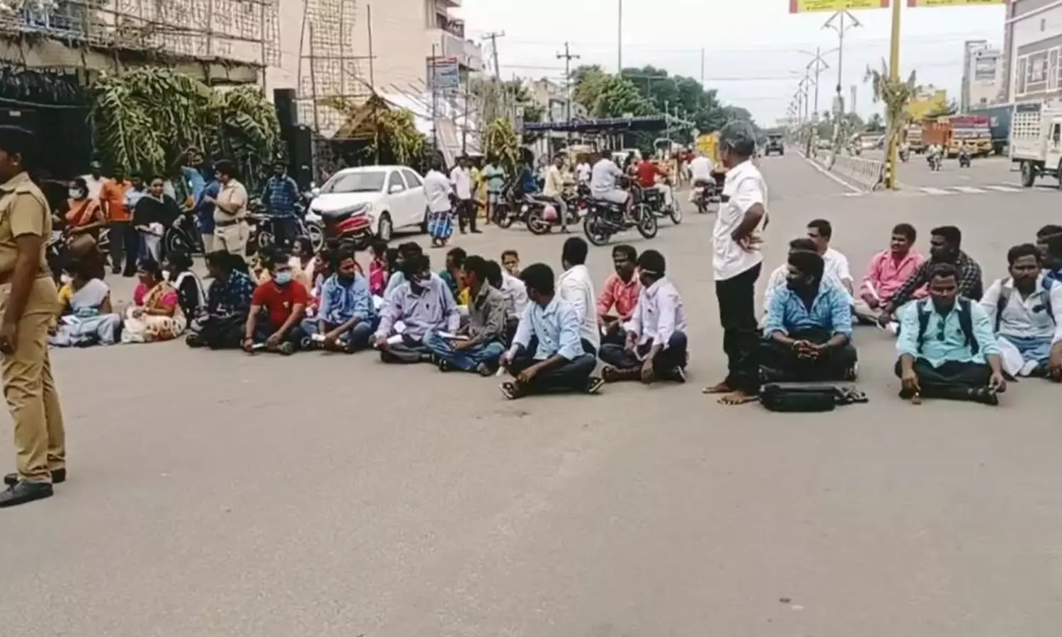 இதனால் ஆத்திரமடைந்த அவர்கள் அனைவரும் தேர்வு மையத்தின் எதிரே காலை 9.25 மணியளவில் சாலையில் அமர்ந்து திடீரென மறியல் போராட்டத்தில் ஈடுபட்டனர். இதன் காரணமாக விழுப்புரம்- திருச்சி நெடுஞ்சாலையில் வாகன போக்குவரத்து பாதிக்கப்பட்டது.