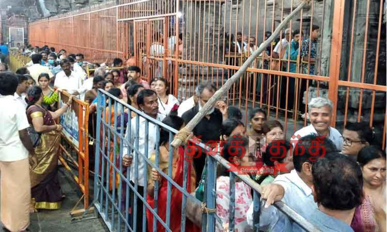 திருவண்ணாமலை அருணாசலேஸ்வரர் கோவிலில் பக்தர்கள் கூட்டம் அலைமோதியது. இதனால் சாமி தரிசனம் செய்வதற்காக கோவிலில் நீண்ட வரிசையில் காத்திருந்த பக்தர்களை படத்தில் காணலாம்.