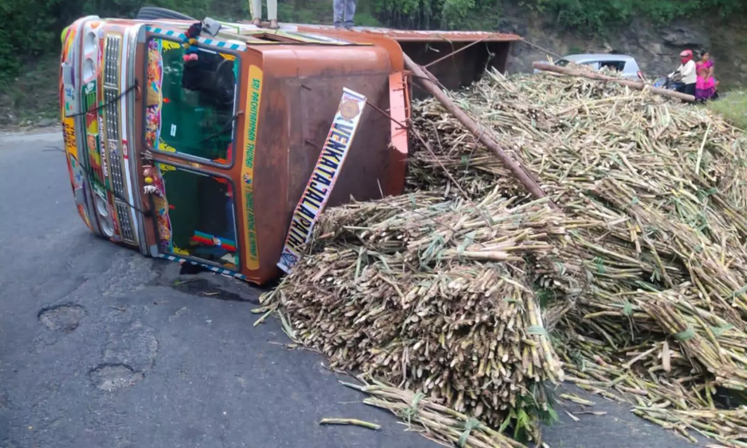 திம்பம் மலைப்பாதையில் கரும்பு லாரி கவிழ்ந்து விபத்து- 3 மணி நேரம் போக்குவரத்து பாதிப்பு