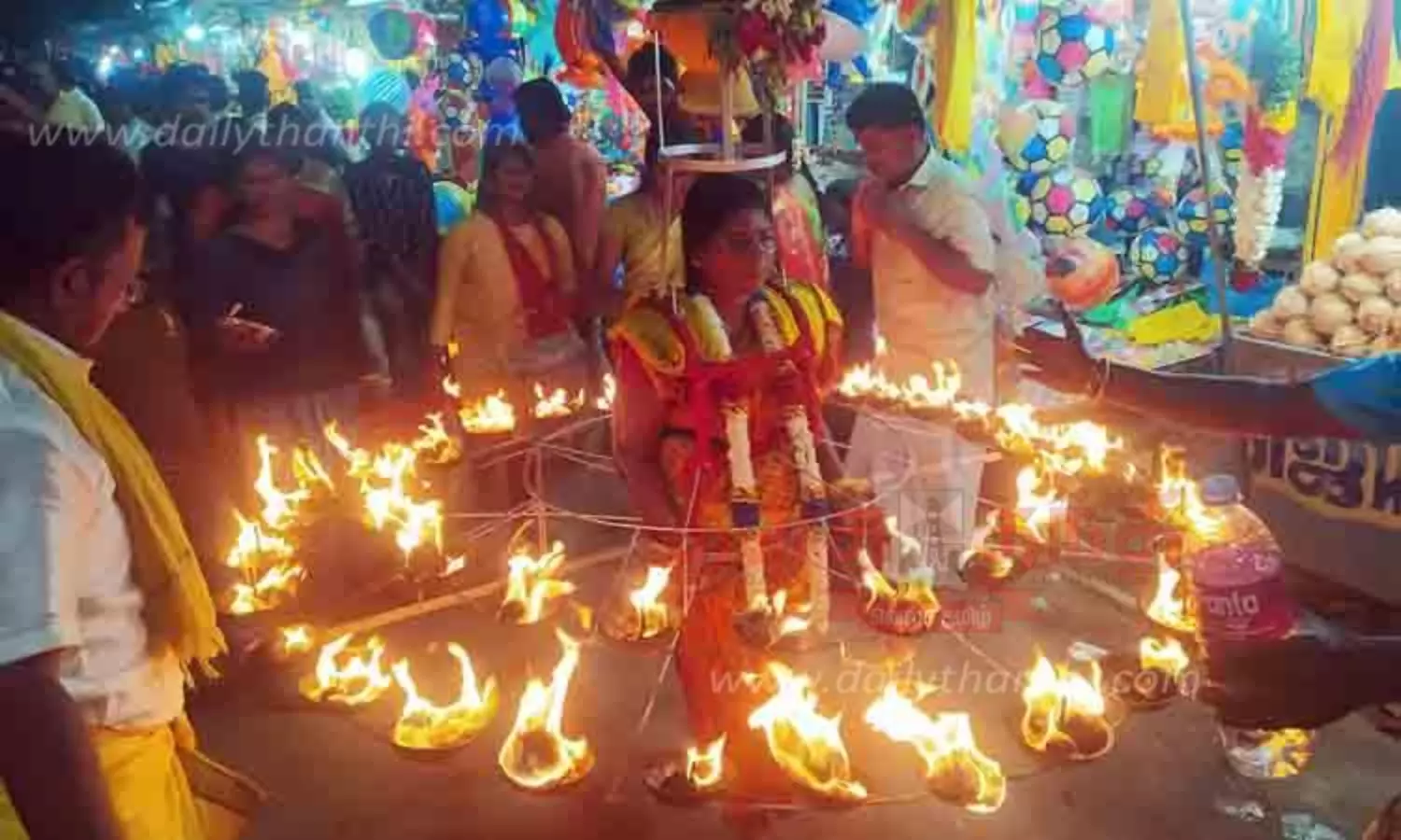 காரைக்குடி மீனாட்சிபுரம் முத்துமாரியம்மன் கோவிலில் நடைபெற்று வரும் மாசி-பங்குனி திருவிழாவில் பக்தர் ஒருவர் அக்னி சட்டி எடுத்து வந்து நேர்த்திக்கடன் செலுத்திய காட்சி.காரைக்குடி மீனாட்சிபுரம் முத்துமாரியம்மன் கோவிலில் நடைபெற்று வரும் மாசி-பங்குனி திருவிழாவில் பக்தர் ஒருவர் அக்னி சட்டி எடுத்து வந்து நேர்த்திக்கடன் செலுத்திய காட்சி.