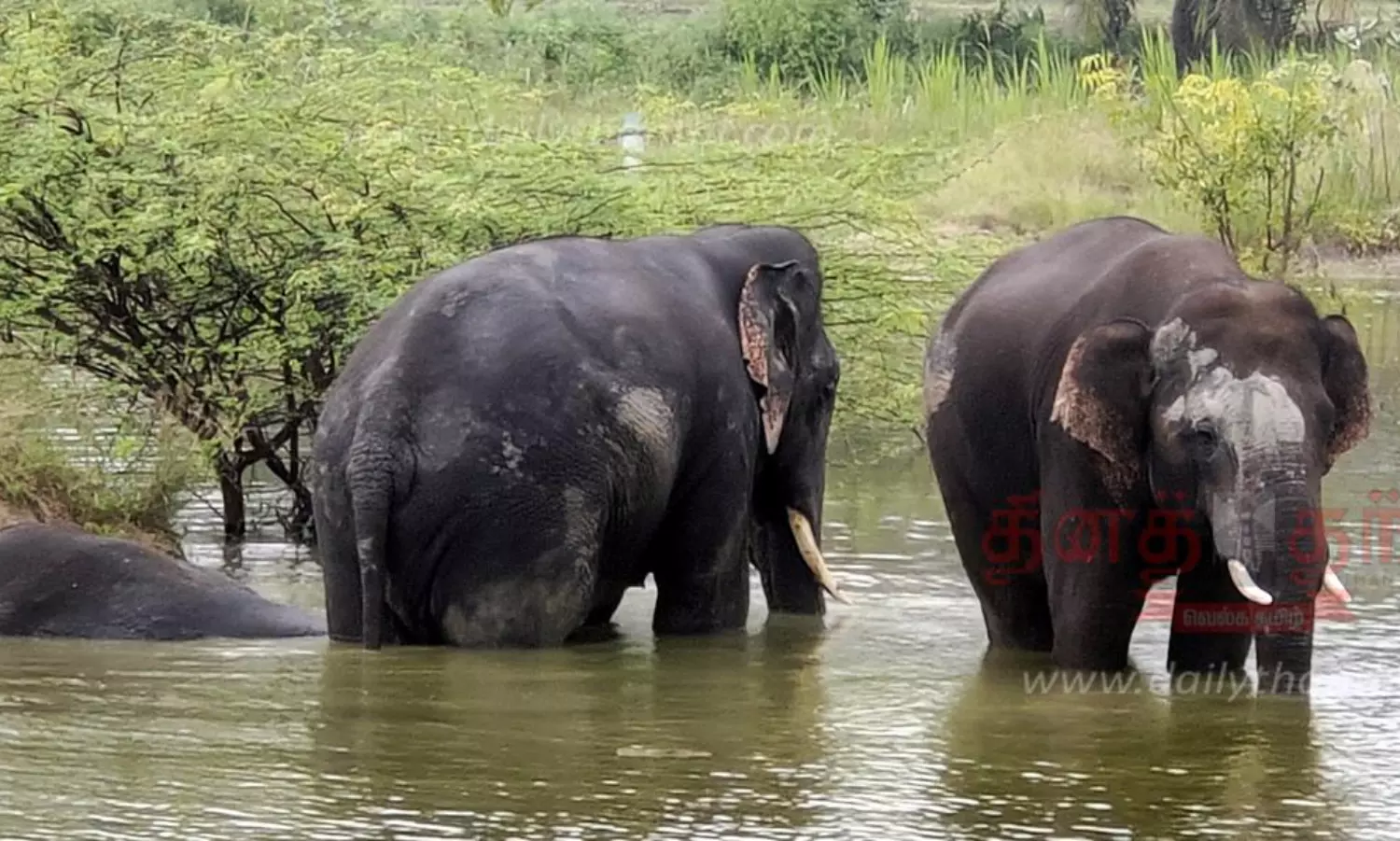 பின்னர் ஒன்றன் மீது மற்றொன்று துதிக்கையால் தண்ணீரை அடித்து விளையாடியது. மேலும் தண்ணீரில் விளையாடிய சோர்வில் சிறிது நேரம் ஏரிக்கரையையொட்டி தண்ணீரில் யானைகள் படுத்துக் கொண்டன. இதை அந்த பகுதி பொதுமக்கள் வேடிக்கை பார்த்தனர்.