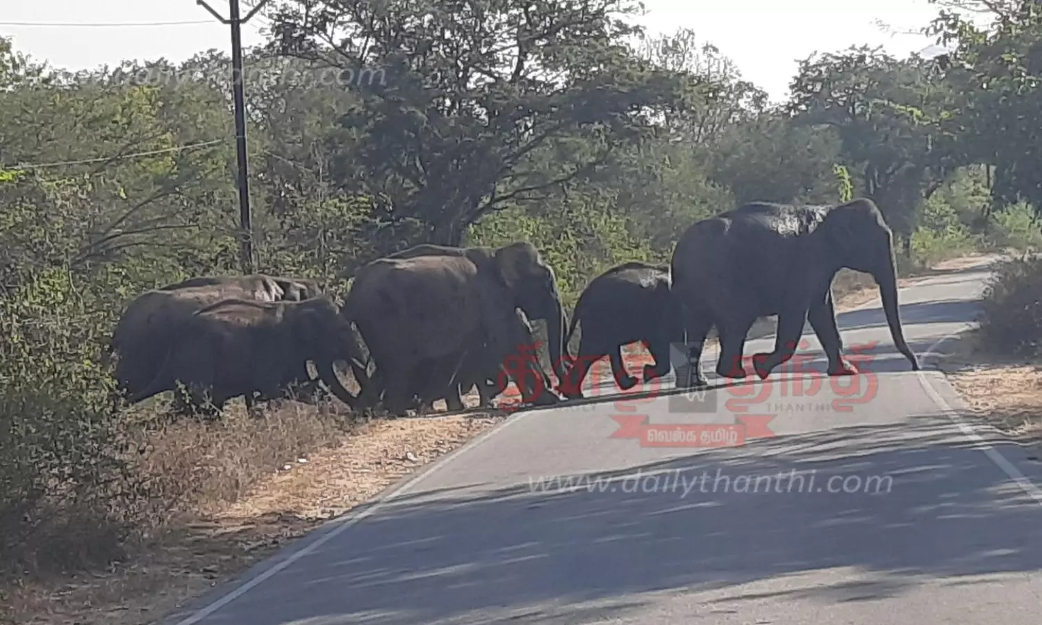 அஞ்செட்டி அருகே நேற்று யானைகள் சாலையை கடந்து மலசோனை வனப்பகுதிக்கு சென்றன. அவற்றை கர்நாடக வனப்பகுதிக்கு விரட்ட வனத்துறை தீவிர நடவடிக்கை மேற்கொண்டுள்ளனர்.