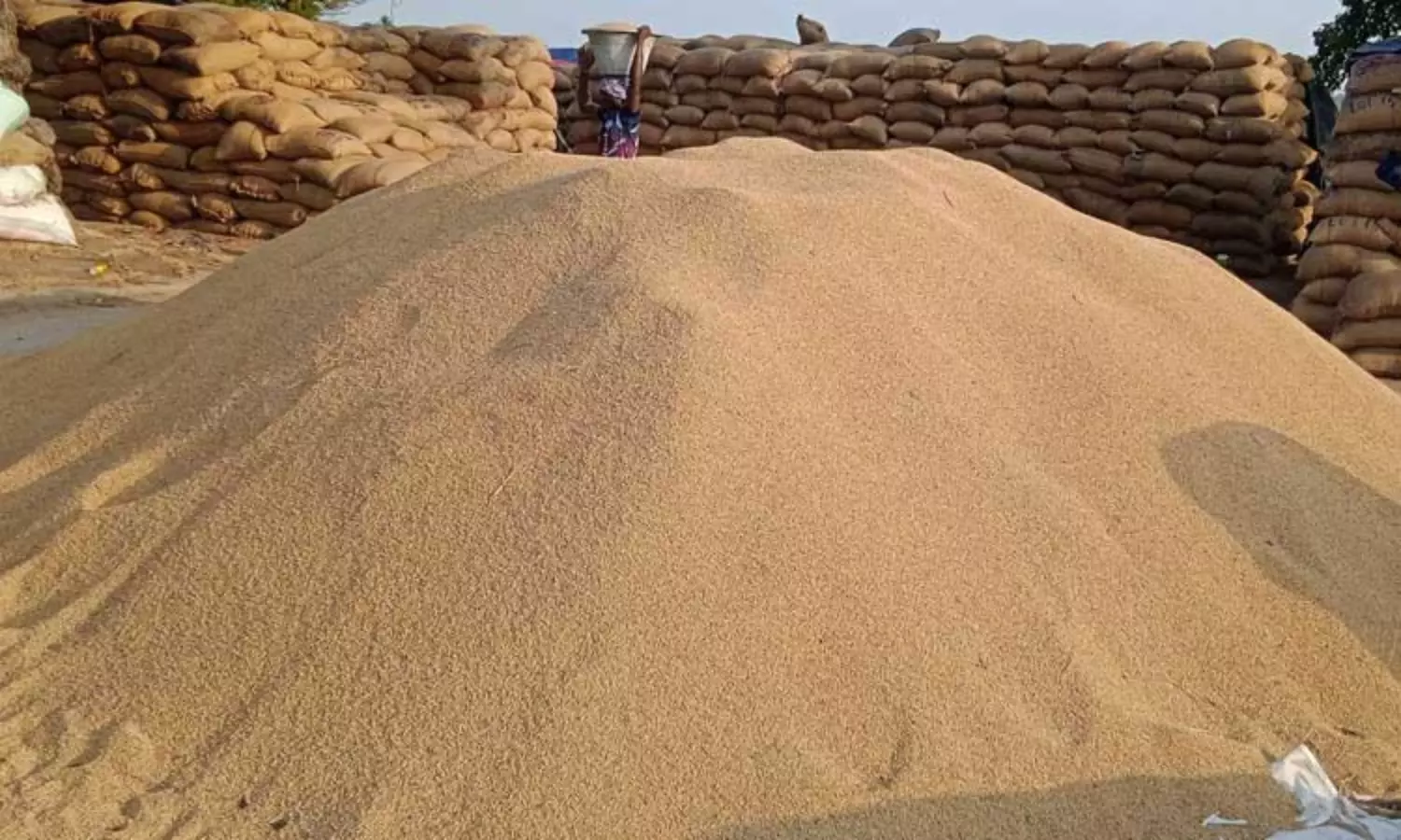 இந்த நெல் கொள்முதல் நிலையத்தில் நடைபெற்ற முறைகேடு காரணமாக கடந்த 15 நாட்களுக்கு முன்பு அதிகாரி ஒருவர் மாற்றம் செய்யப்பட்டுள்ளார். அதன் பிறகு நெல் கொள்முதல் நிலையம் செயல்படவில்லை. ஆனால் விவசாயிகளிடம் இருந்து வாங்கப்பட்ட 5 ஆயிரத்திற்கும் மேற்பட்ட நெல் மூட்டைகளை குடோனுக்கு ஏற்றி செல்லாமல் கொள்முதல் நிலையத்திலேயே அடுக்கி வைக்கப்பட்டுள்ளன.