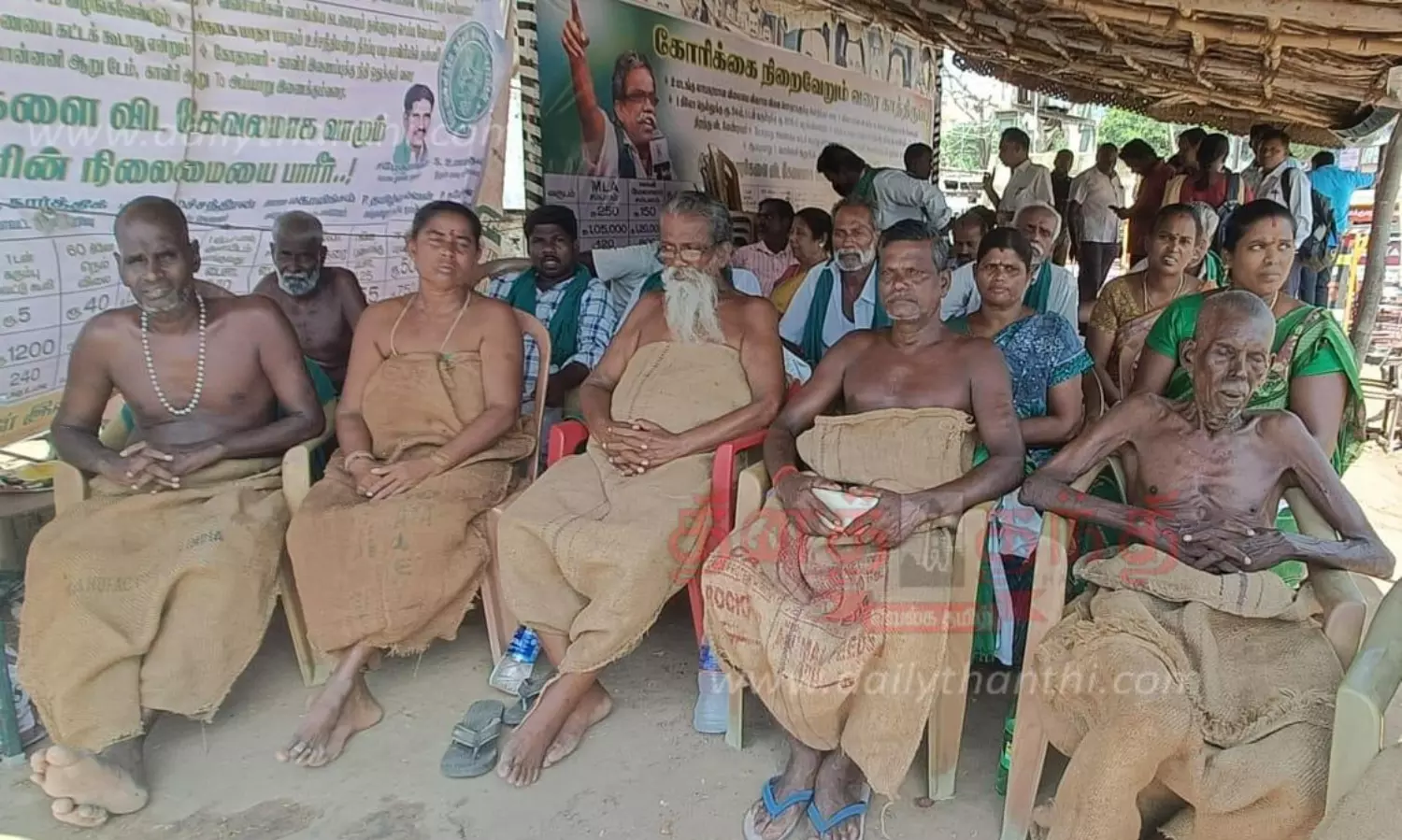 சாக்குப்பையை உடலில் கட்டிக்கொண்டு விவசாயிகள் போராட்டம்