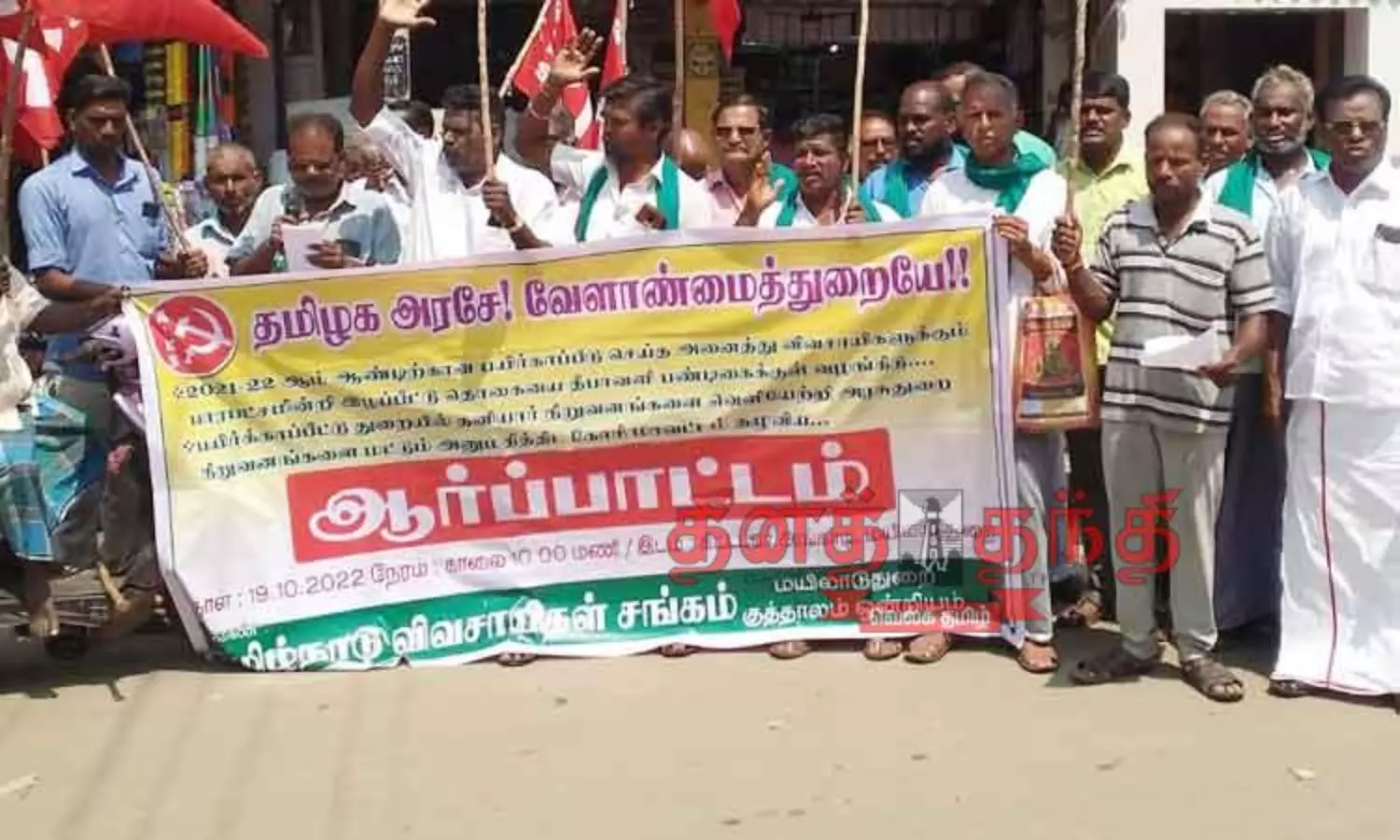 பயிர் காப்பீடு இழப்பீட்டு தொகையை பாரபட்சம் இன்றி வழங்கக் கோரி மயிலாடுதுறை கிட்டப்பா அங்காடி முன்பு தமிழ்நாடு விவசாயிகள் சங்கத்தினர் ஆர்ப்பாட்டத்தில் ஈடுபட்டனர்.;