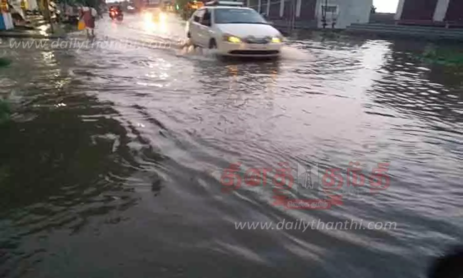 வெம்பக்கோட்டை பஸ் நிறுத்தம் அருகே சிவகாசி, சங்கரன்கோவில் செல்லும் மெயின் ரோட்டில் ஒரு வங்கிக்கு அருகே மழை நீர் செல்ல வழி இல்லாததால் சாலையில் குளம் போல் தண்ணீர் தேங்கி நின்றது.