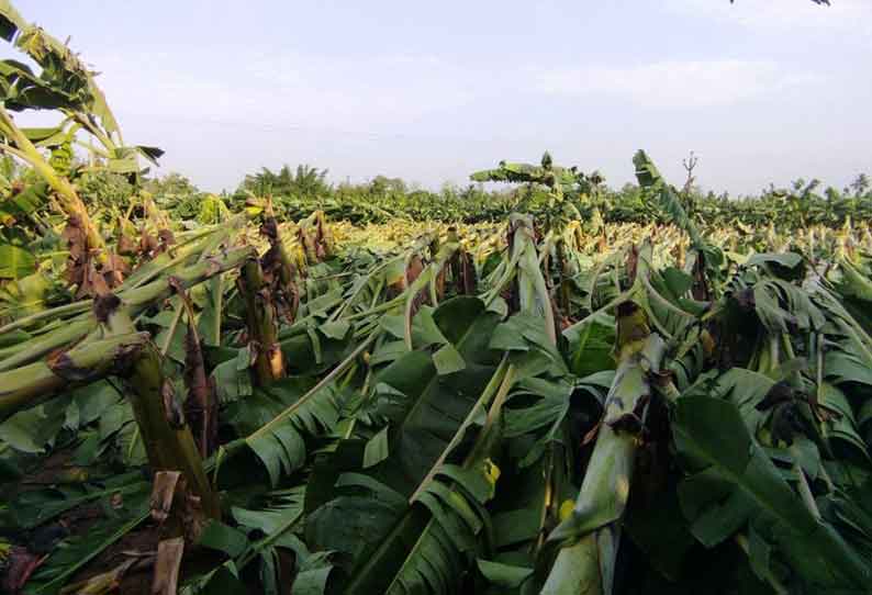 மாவட்டம் முழுவதும் 12 ஆயிரத்து 500 ஏக்கர் வாழை சாகுபடியை விவசாயிகள் செய்திருந்தனர். இவற்றில் 500 ஏக்கர் வாழை மரங்கள் குலை தள்ளிய நிலையில் முறிந்து விழுந்தது. இதை பார்த்த விவசாயிகள் மிகுந்த கவலை அடைந்தனர். கடன் வாங்கி பயிரிட்டுள்ள வாழை மரங்கள் இப்படி சூறைகாற்றில் விழுந்து விட்டதே என்று கண்ணீர் வடித்தனர்.
