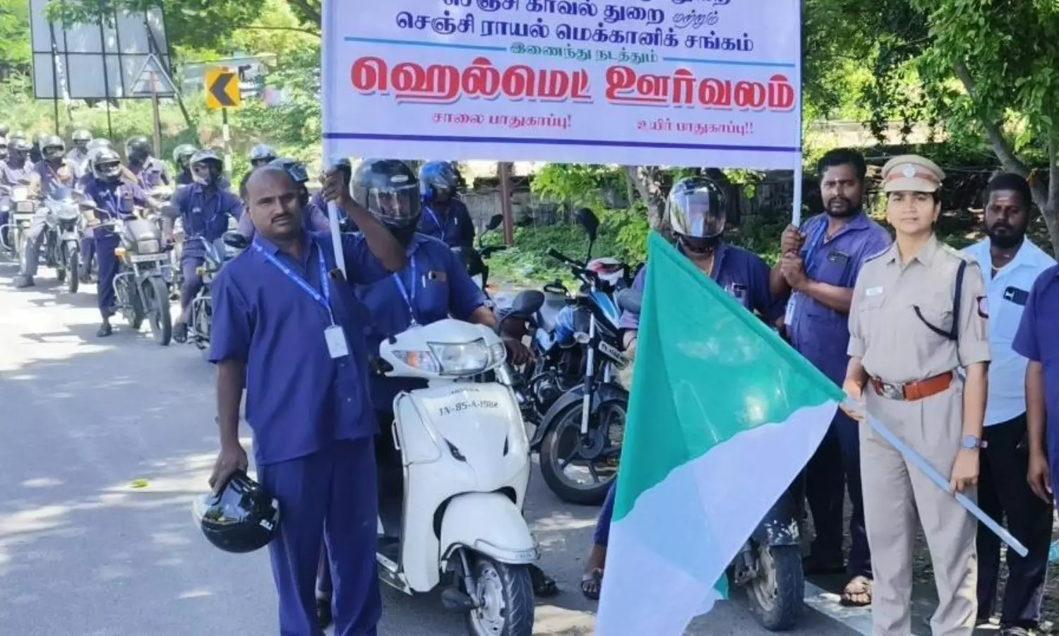 செஞ்சி போக்குவரத்து போலீசார் மற்றும் ராயல் மெக்கானிக் சங்கம் சார்பில் ஹெல்மெட் விழிப்புணர்வு ஊர்வலம் செஞ்சி சங்கராபரணி ஆற்றங்கரை அருகே நடைபெற்றது. இதற்கு போக்குவரத்து போலீஸ் இன்ஸ்பெக்டர் பாண்டியராஜன் தலைமை தாங்கினார். செஞ்சி துணை போலீஸ் சூப்பிரண்டு கவினா கலந்துகொண்டு கொடியசைத்து ஊர்வலத்தை தொடங்கி வைத்தார். அப்போது இரு சக்கர வாகன ஓட்டிகள் ஹெல்மெட் இன்றி வாகனம் ஓட்டக்கூடாது, விபத்துகளை தவிர்க்க சாலை விதிமுறைகளை அனைவரும் பின்பற்ற வேண்டும் என்பதை வலியுறுத்தி பலர் ஹெல்மெட் அணிந்து இருசக்கர வாகனத்தில் ஊர்வலமாக சென்றனர். இந்த ஊர்வலம் முக்கிய வீதிகள் வழியாக சென்று வந்தது. நிகழ்ச்சியில் சிறப்பு சப்-இன்ஸ்பெக்டர் பழனி, போலீஸ்காரர்கள் சராசந்த், காத்தவராயன் மற்றும் ராயல் மெக்கானிக் சங்க நிர்வாகிகள் உள்பட பலர் கலந்து கொண்டனர்.