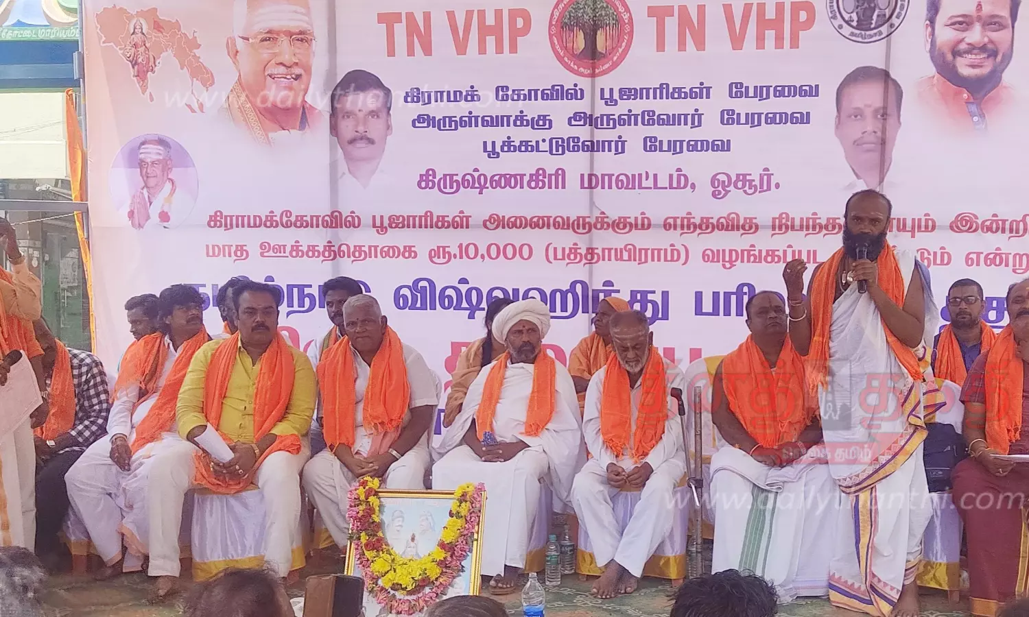 ஓசூரில் தமிழ்நாடு விசுவ இந்து பரிஷத் அமைப்பு ஏற்பாட்டில் கிராம கோவில் பூசாரிகள் பேரவை, அருள்வாக்கு அருள்வோர் பேரவை, பூ கட்டுவோர் பேரவை ஆகியவற்றின் சார்பில் கவனஈர்ப்பு ஆர்ப்பாட்டம் நடந்தது. தமிழ்நாடு விசுவ இந்து பரிஷத் அமைப்பின் மாவட்ட தலைவர் கங்காதரன், கோட்ட தலைவர் மஞ்சுசாமி, மாவட்ட செயலாளர் நரசிம்மன் ஆகியோர் தலைமை தாங்கினர். சிறப்பு அழைப்பாளர்களாக ஜவளகிரி ஆசிரம தலைவர் ரத்தினகுமார் சுவாமிகள், பூசாரி பேரவை செயலாளர் விஜயகுமார், ரமேஷ் ஆகியோர் கலந்து கொண்டு பேசினர்.