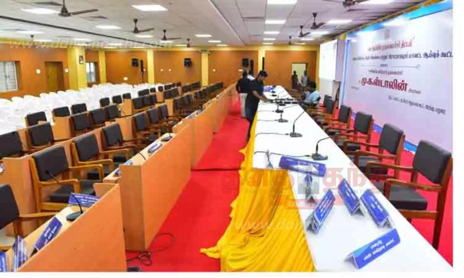 முதல்-அமைச்சர் மு.க.ஸ்டாலின் இன்று மதுரை வந்து 5 மாவட்டங்களுக்கான மக்கள் நலத்திட்டங்கள் பற்றி கள ஆய்வு செய்கிறார். 5 மாவட்டங்களின் உயர் அதிகாரிகள் கலந்துகொள்கிறார்கள். இதற்காக மதுரை கலெக்டர் அலுவலக கூட்ட அரங்கு நேற்று தயார் நிலையில் வைக்கப்பட்டதை படத்தில் காணலாம்.