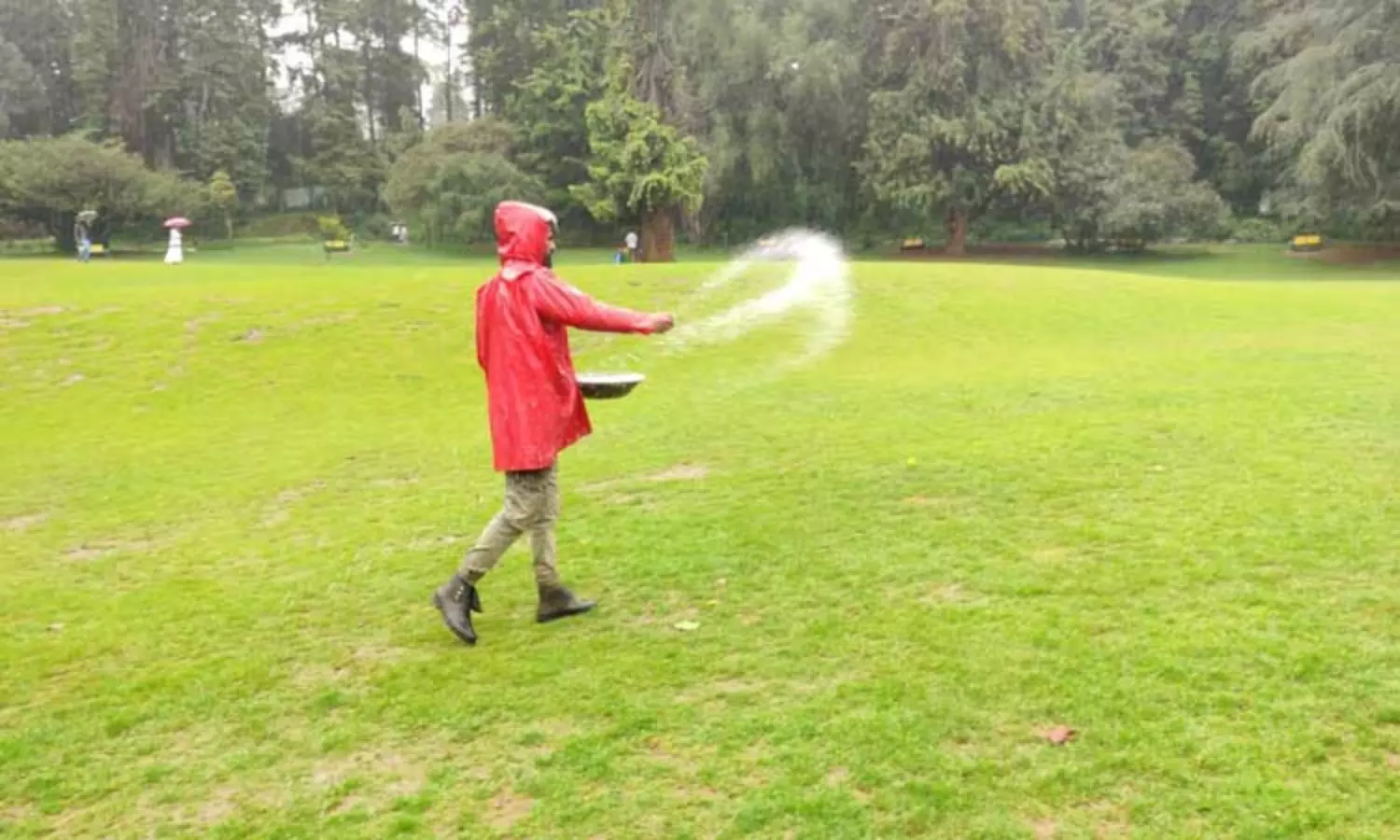 புல்வெளியில் யூரியா தூவும் பணி