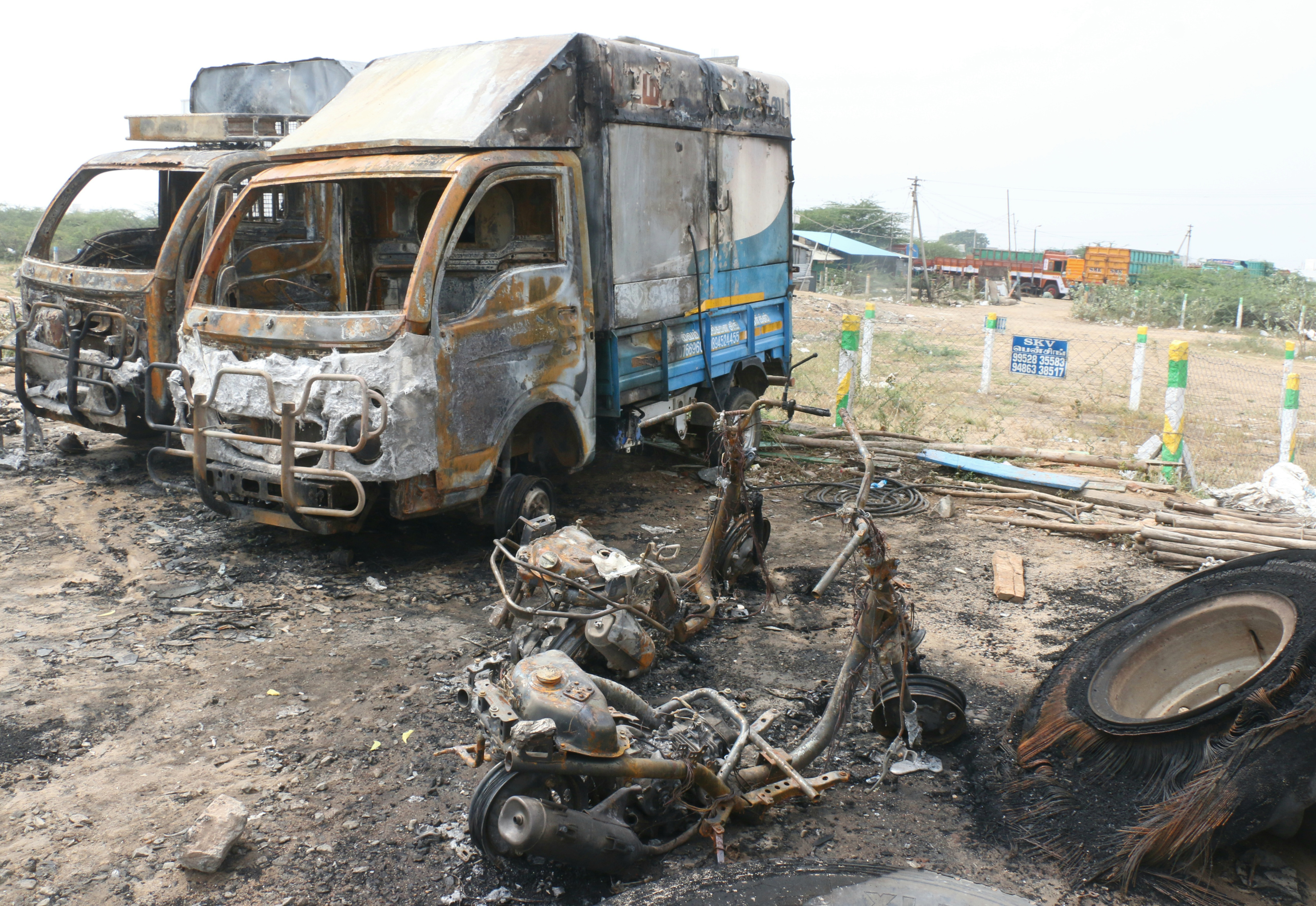 இந்த பயங்கர மோதலை தொடர்ந்து கருப்பு என்ற கருப்பசாமியின் உறவினர்கள், நண்பர்கள் சங்கரப்பேரி அருகே உள்ள டயர் வல்கனைசிங் கடையை அடித்து சேதப்படுத்தினர். அதன் முன்புள்ள ஷெட்டில் நிறுத்தப்பட்டிருந்த 2 மோட்டார்சைக்கிள்கள், 2 லோடு ஆட்டோக்கள் தீ வைத்து எரிக்கப்பட்டன.