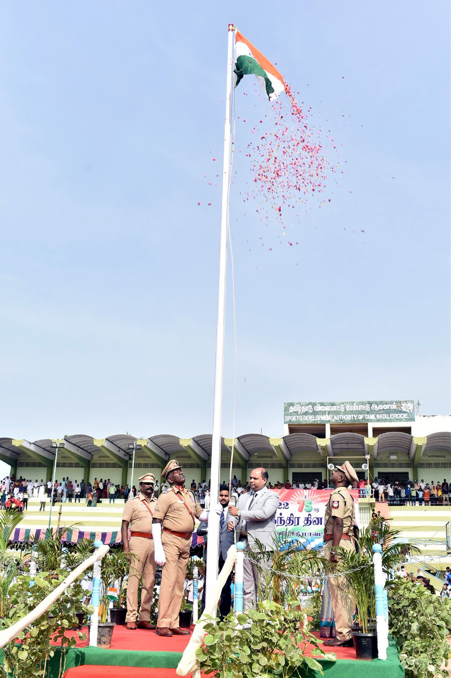 ஈரோடு மாவட்ட நிர்வாகம் சார்பில் சுதந்திர தின விழா ஈரோடு வ.உ.சி.பூங்கா விளையாட்டு மைதானத்தில் நேற்று நடந்தது. விளையாட்டு அரங்கின் மத்தியில் தேசியக்கொடி ஏற்றுவதற்கான கொடி கம்பம் தயார் நிலையில் இருந்தது. மைதானத்துக்கு காலையில் இருந்தே அதிகாரிகள், பொதுமக்கள் வரத்தொடங்கினார்கள். காலை 9 மணிக்கு ஈரோடு மாவட்ட போலீஸ் சூப்பிரண்டு சசிமோகன் மைதானத்துக்கு வந்து கொடி மேடையை பார்வையிட்டார். அவருக்கு போலீஸ் மரியாதை அளிக்கப்பட்டது.