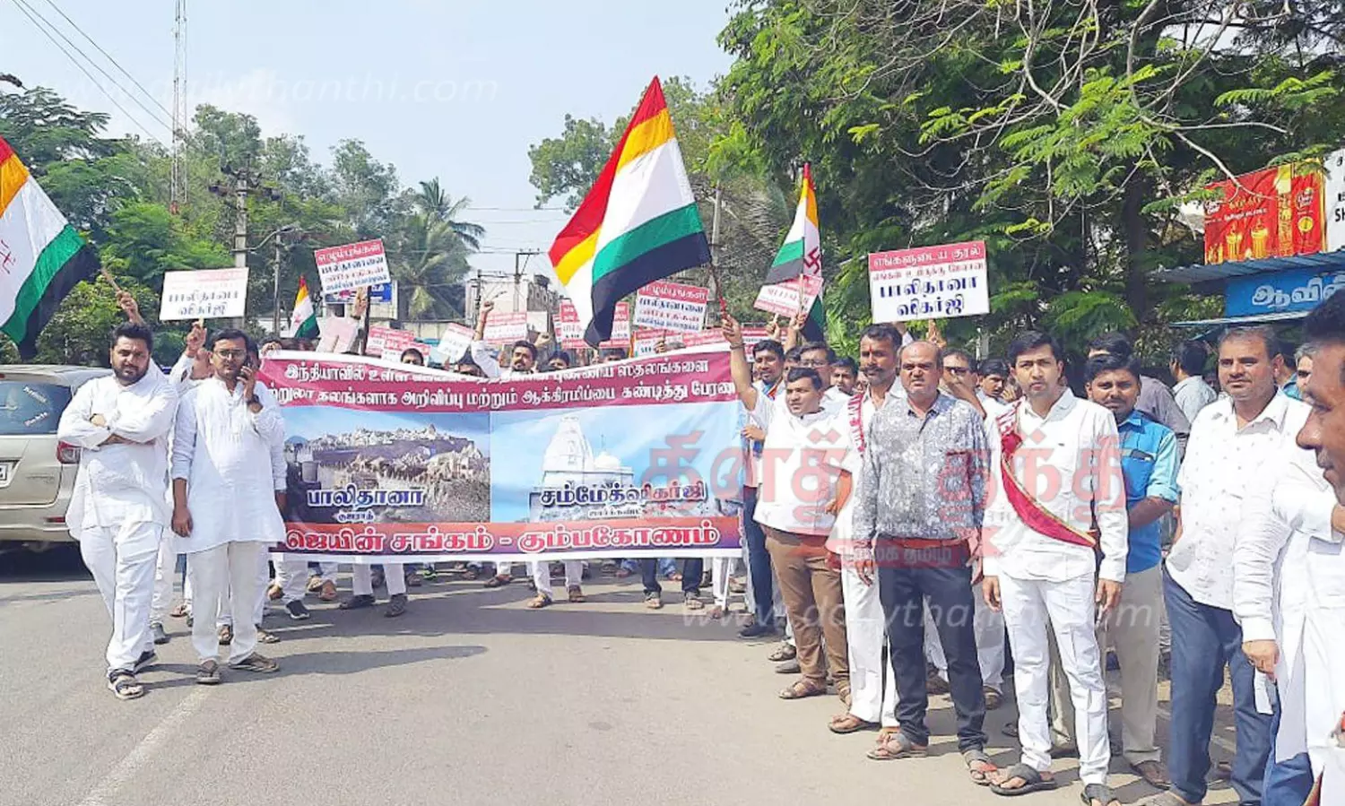 சம்மேத்ஷிகர்ஜி, பாலிதானா, கிர்ணாஜி உள்ளிட்ட ஜெயின்களின் புனித தலங்களை சுற்றுலா நகரமாக மாற்றும் ஜார்கண்ட் மாநில அரசின் திட்டத்துக்கு எதிர்ப்பு தெரிவித்து தஞ்சை மாவட்டம் கும்பகோணத்தில் வசிக்கும் ஜெயின் சமூகத்தை சேர்ந்தவர்கள் ஊர்வலம் சென்றனர்.