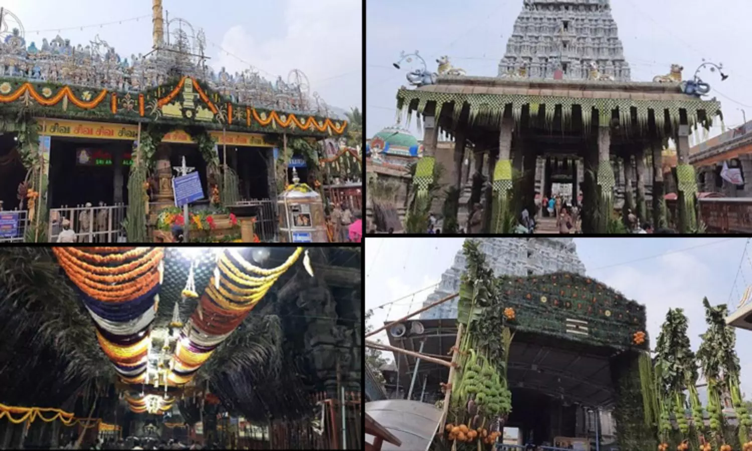 இதேபோல், தங்க கொடி மரம் அமைந்துள்ள மண்டபத்தின் தூண்களில் வாழை மரம் மற்றும் தென்னங்கீற்று கட்டப்பட்டு அலங்கரிக்கப்பட்டுள்ளன. மேலும் முகப்பு பகுதியில் சிவலிங்கம் மற்றும் 2 நந்திகளை தத்ரூபமாக வடிவமைத்து மலர்களைக் கொண்டு தோரணம் கட்டப்பட்டுள்ளது.