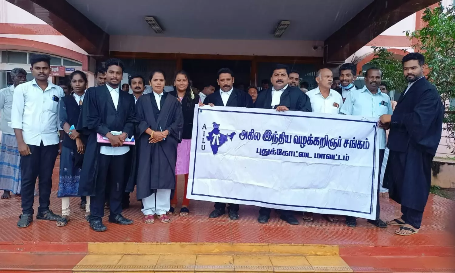 வழக்கறிஞர் சங்கத்தின் (எ.ஐ.எல்.யு.) தமிழ்நாடு மாநிலக்குழு சார்பில் தமிழகம் முழுவதும் உள்ள அனைத்து நீதிமன்றங்களிலும் கோரிக்கை முழக்க ஆர்ப்பாட்டம் நடத்தியது. அதன் ஒரு பகுதியாக புதுக்கோட்டை மாவட்டம், அறந்தாங்கி ஒருங்கிணைந்த நீதிமன்ற வளாகத்தில் அகில இந்திய வழக்கறிஞர் சங்க புதுக்கோட்டை மாவட்ட துணை தலைவர் ஜான்சி மகாராணி தலைமையில் நேற்று கோரிக்கை முழக்க ஆர்ப்பாட்டம் நடைபெற்றது. இதில் வழக்கறிஞர்கள் தமிழ் மொழியை வழக்காடு மொழியாக்குவதன் அவசியத்தை விளக்கி பேசினர். ஆர்ப்பாட்டத்தில் உயர்நீதிமன்றத்தில் தமிழை வழக்காடும் மொழியாக அறிவிக்க கோரி கோஷங்களை எழுப்பினர்.