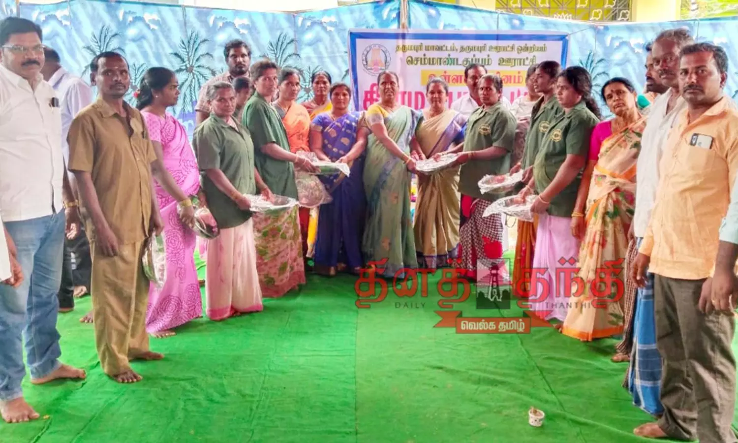 தர்மபுரி ஒன்றியம் செம்மாண்டகுப்பம் ஊராட்சி சார்பில் உள்ளாட்சி தினத்தையொட்டி குண்டலப்பட்டி கிராமத்தில் கிராம சபை கூட்டம் நடந்தது. இந்த கூட்டத்திற்கு ஊராட்சி மன்ற தலைவர் பானு பூமணி தலைமை தாங்கினார். துணை தலைவர் தேவி அருள் ஞானசேகரன் மற்றும் வார்டு உறுப்பினர்கள் முன்னிலை வகித்தனர். ஊராட்சி செயலாளர்கள் இடும்பன் வரவேற்று பேசினார். இந்த கூட்டத்தில் ஏராளமான பொதுமக்கள் மற்றும் மகளிர் குழு உறுப்பினர்கள் கலந்து கொண்டு பல்வேறு கோரிக்கைகளை வலியுறுத்தி பேசினர். வட்டார வளர்ச்சி அலுவலக சாலை பணியாளர் சித்ரா கூட்டு நடவடிக்கைகளை பார்வையிட்டார். கூட்டத்தில் உள்ளாட்சி தினத்தையொட்டி தூய்மை பணியாளர்களுக்கு பாராட்டு தெரிவித்து கவுரவிக்கப்பட்டனர். இதில் அரசு துறை அலுவலர்கள், பள்ளி தலைமை ஆசிரியர்கள், ரேஷன் கடை பணியாளர்கள், அங்கன்வாடி பணியாளர்கள் கலந்து கொண்டனர்.
