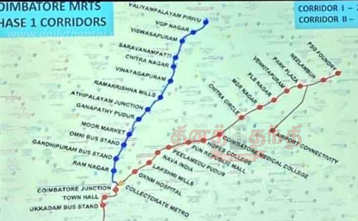 கோவையில் அவினாசி ரோடு, சத்தி ரோடு ஆகிய 2 வழித் தடங்களில் மெட்ரோ ரெயில் திட்டம் செயல்படுத்தப்படு கிறது. இது 45 கிலோ மீட்டர் தூரத்தில் 30 இடங்களை இணைக்கும் வகையில் இயக்கப்படுகிறது.;