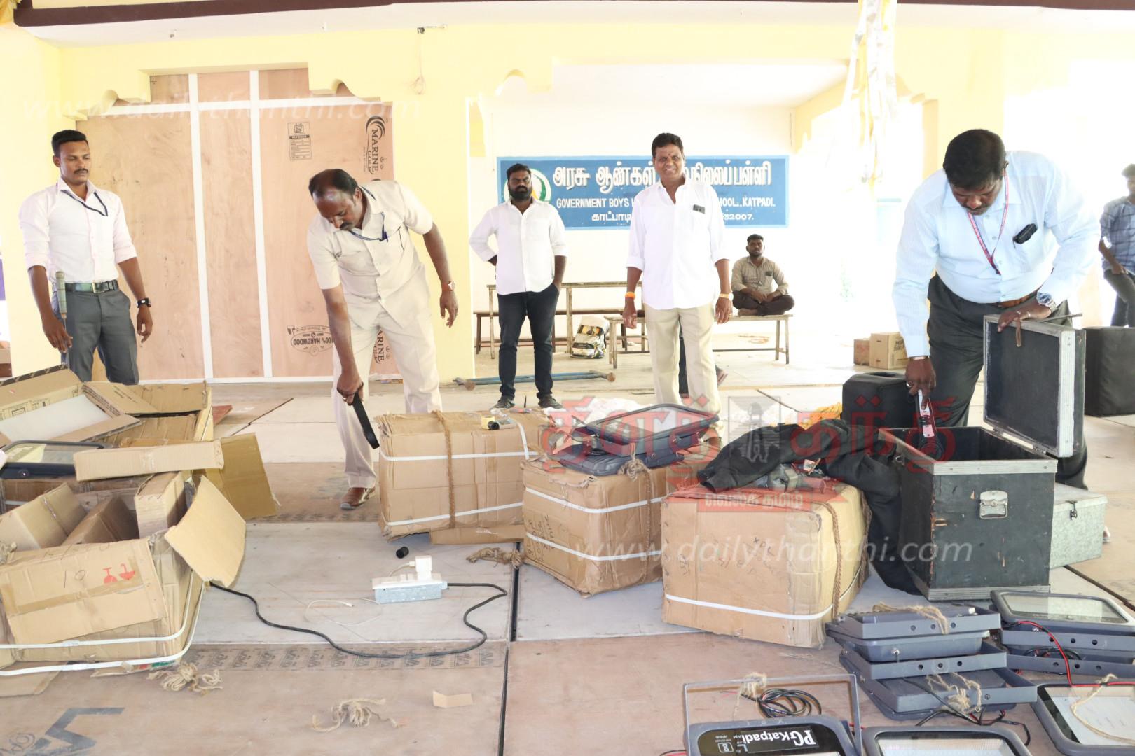 பாதுகாப்பு ஏற்பாடுகள் குறித்து கலெக்டர் குமாரவேல்பாண்டியன், மாவட்ட போலீஸ் சூப்பிரண்டு ராஜேஷ்கண்ணன் மற்றும் அதிகாரிகள் ஆய்வு செய்தனர். மேலும் காட்பாடி அரசு ஆண்கள் மேல்நிலைப்பள்ளியில் வண்ணம் பூசும் பணி நடந்தது. இதனால் பள்ளி கட்டிடங்கள் புதுப்பொலிவு பெற்றது. மேலும் மரங்கிளைகள் அகற்றப்பட்டது. விழா மேடை அமைக்கும் பணிகள் நடந்தது. பள்ளி வளாகத்தில் மணல் கொட்டப்பட்டு ஹாலோ பிளாக் கற்கள் பதிக்கும் பணி மும்முரமாக நடந்தது. விழா அரங்கில் துப்பாக்கி ஏந்திய போலீஸ் பாதுகாப்பு போடப்பட்டுள்ளது.
