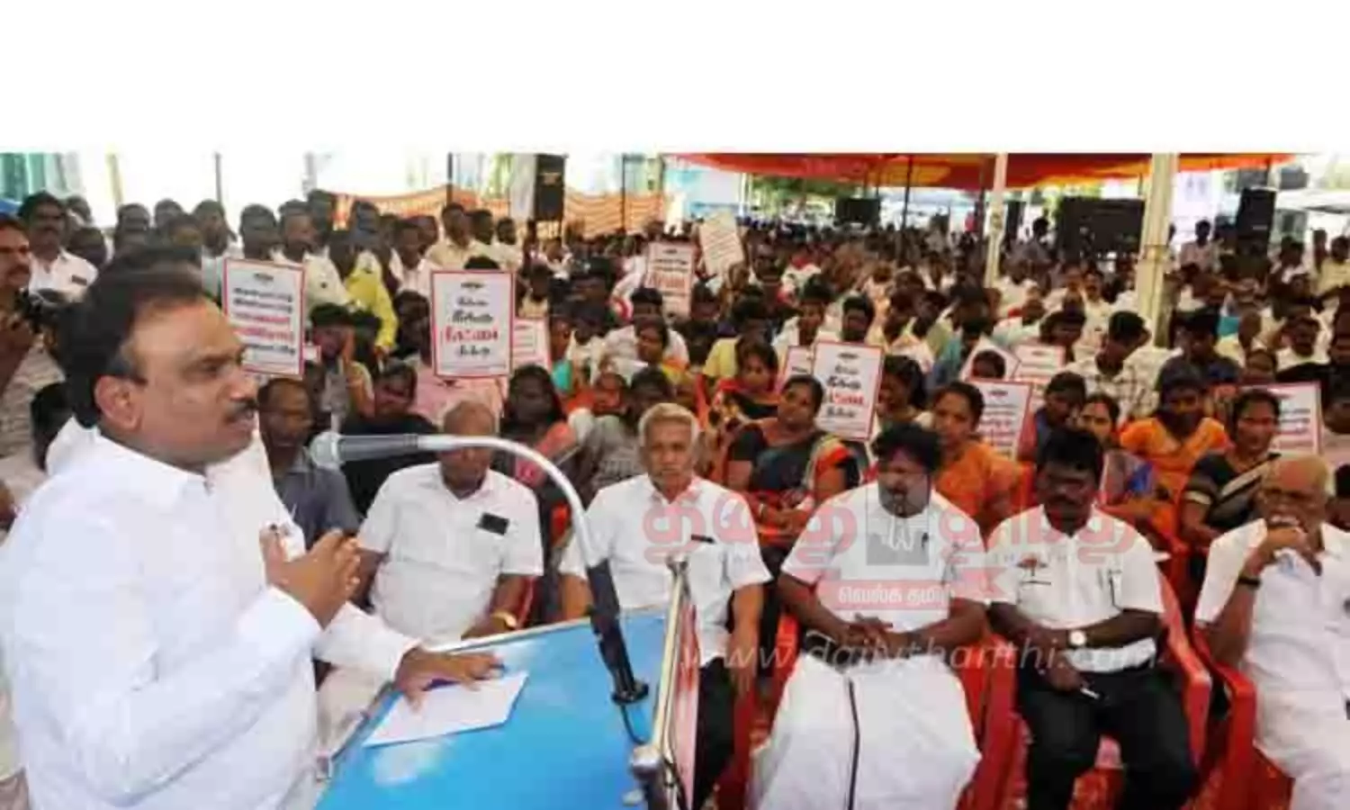காலையில் தி.மு.க.வினர் தொடங்கிய உண்ணாவிரத போராட்டத்தை மாலையில் ராசா எம்.பி. பழச்சாறு கொடுத்து முடித்து வைத்தார். இதில் கட்சியின் நிர்வாகிகள், தொண்டர்கள் மற்றும் கூட்டணி கட்சியினர், மாணவர்கள் கலந்து கொண்டனர்.