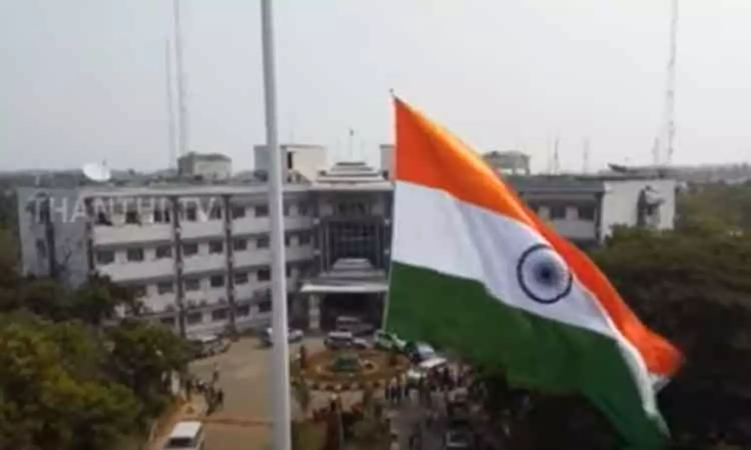 100 அடி உயர கம்பத்தில் மூவர்ணக் கொடி பட்டொளி வீசி பறந்தது காண்போரை பரவசமடையச் செய்தது.;
