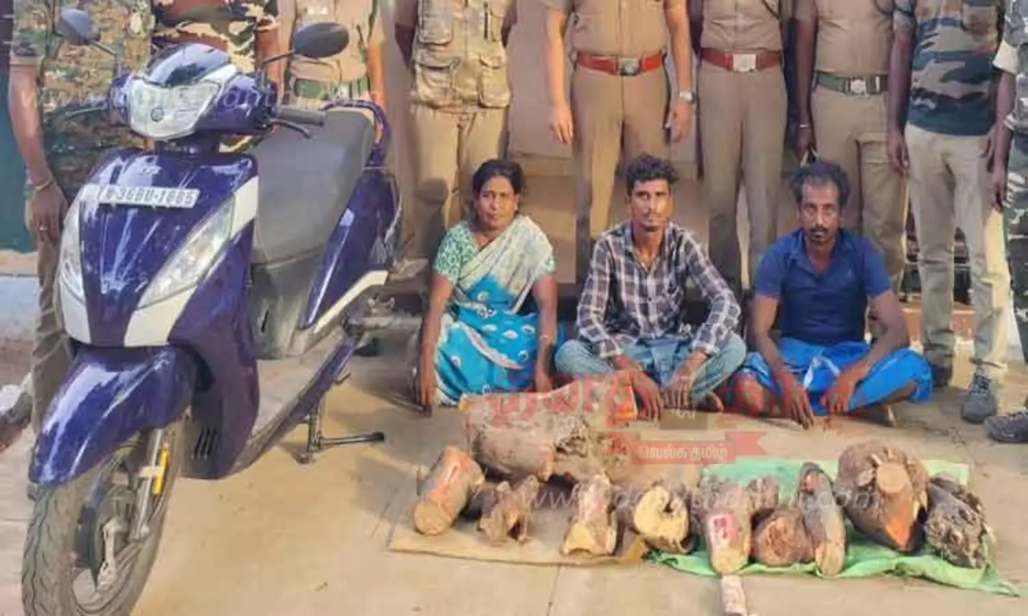 விசாரணையில், 'அவர்கள் பவானிசாகர் அருகே உள்ள பனையம்பள்ளி சொலவனூரை சேர்ந்த சின்னதம்பி (வயது 37), அவருடைய மனைவி பெரியம்மாள் (35), தொப்பம்பாளையம் மணல்மேடு பகுதியை சேர்ந்த பழனிச்சாமி மகன் ராஜேஷ்குமார் (22) என்பதும், அவர்கள் நீண்ட நாட்களாக பண்ணாரி அடுத்த ராஜன்நகர், கே.என்.பாளையம் உள்ளிட்ட பகுதிகளில் புறம்போக்கு மற்றும் தனியாருக்கு சொந்தமான பட்டா இடங்களில் உள்ள சந்தன மரங்களை யாருக்கும் தெரியாமல் வெட்டி துண்டுகளாக்கி கடத்தி வந்தது,' தெரியவந்தது. இதைத்தொடர்ந்து அவர்கள் 3 பேரையும் வனத்துறையினர் கைது செய்தவுடன், அவர்களிடம் இருந்து வெட்டப்பட்ட சந்தன மரத்தின் துண்டுகள் மற்றும் ஸ்கூட்டர் ஆகியவற்றையும் பறிமுதல் செய்தனர்.