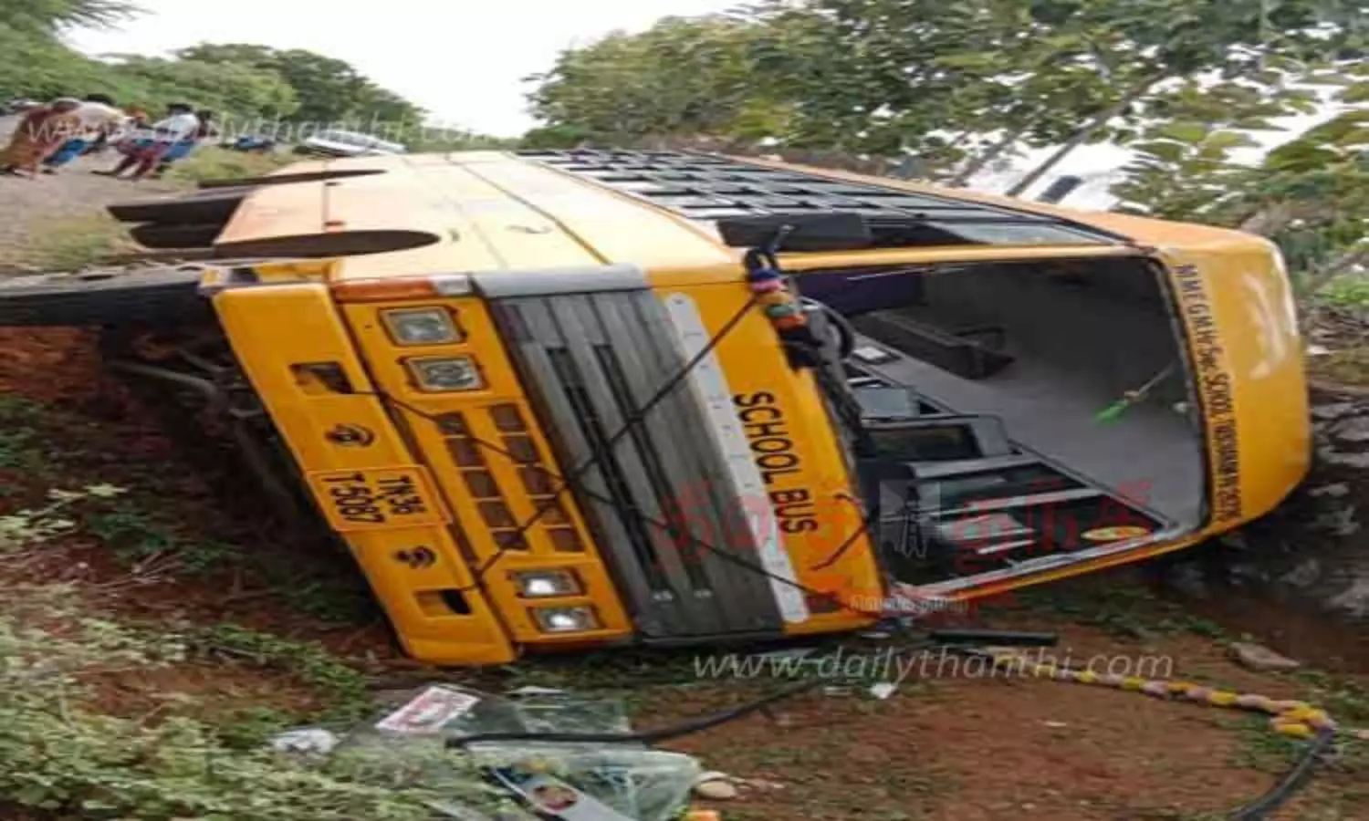 புஞ்சைபுளியம்பட்டி அருகே உள்ள வடுகபாளையத்தில் ஒரு தனியார் பள்ளிக்கூடம் செயல்பட்டு வருகிறது. நேற்று காலை மாணவ, மாணவிகளை பள்ளிக்கு அழைத்து வருவதற்காக பள்ளிக்கு சொந்தமான வேன் புங்கம்பள்ளிக்கு சென்றது. புஞ்ைசபுளியம்பட்டி டானா புதூரை சேர்ந்த ஆனந்த் என்கிற கார்த்திகேயன் (வயது 37) என்பவர் வேனை ஓட்டினார். புங்கம்பள்ளியில் 20 மாணவ, மாணவிகளை ஏற்றிக்கொண்டு பள்ளியை நோக்கி வேன் சென்றுகொண்டு இருந்தது. புஞ்சைபுளியம்பட்டி அருகே உள்ள செல்லம்பாளையம் தளபதி நகர் பகுதியில் ஒரு வளைவில் திரும்பும்போது வேன் கட்டுப்பாட்டை இழந்து சாலையோரத்தில் இருந்த பள்ளத்தில் கவிழ்ந்தது.