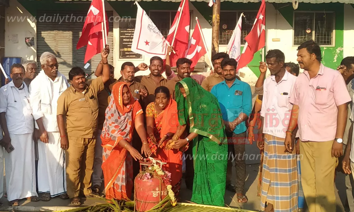 சமையல் கியாஸ் சிலிண்டர் விலை உயர்வை கண்டித்து நூதன போராட்டம் நடந்தது.;