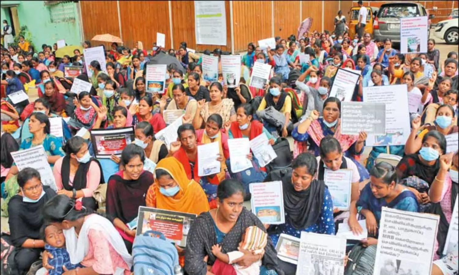 அரசு தகுதித்தேர்வு மூலம் (எம்.ஆர்.பி.) நடத்தப்பட்ட தேர்வில் தேர்ச்சி அடைந்து தகுதி பெற்றவர்களாக இருந்த நாங்கள், தற்போது தகுதியிழந்துவிட்டோமா? என்று கோஷமிட்ட அவர்கள், எம்.ஆர்.பி. தகுதித்தேர்வில் தேர்ச்சி பெற்று பணியில் சேர்ந்தவர்களை மாவட்ட சுகாதாரத்துறை மூலம் பணிமாற்றம் செய்யும் நடவடிக்கையை நிறுத்த வேண்டும் என்ற கோரிக்கையையும் முன்வைத்தனர்.