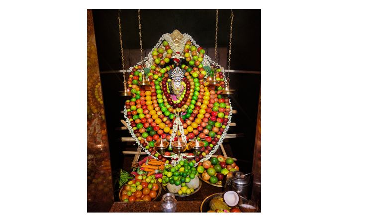 ஆடி கடைசி வெள்ளிக் கிழமையையொட்டி பழங்களால் சிறப்பு அலங்காரத்தில் மேல்கூடலூர் மாரியம்மன்.